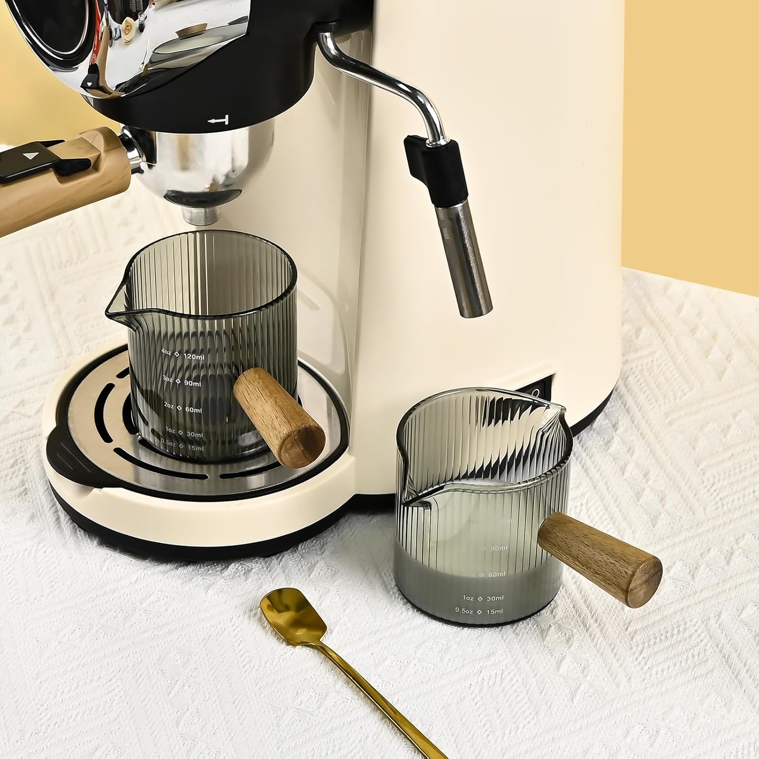 - Attractive Design: The espresso cup has a simple and exquisite appearance; with double spouts for easy pouring; a clear scale on the body of the cup to keep track of the amount of coffee you need; a wooden handle for a more comfortable grip