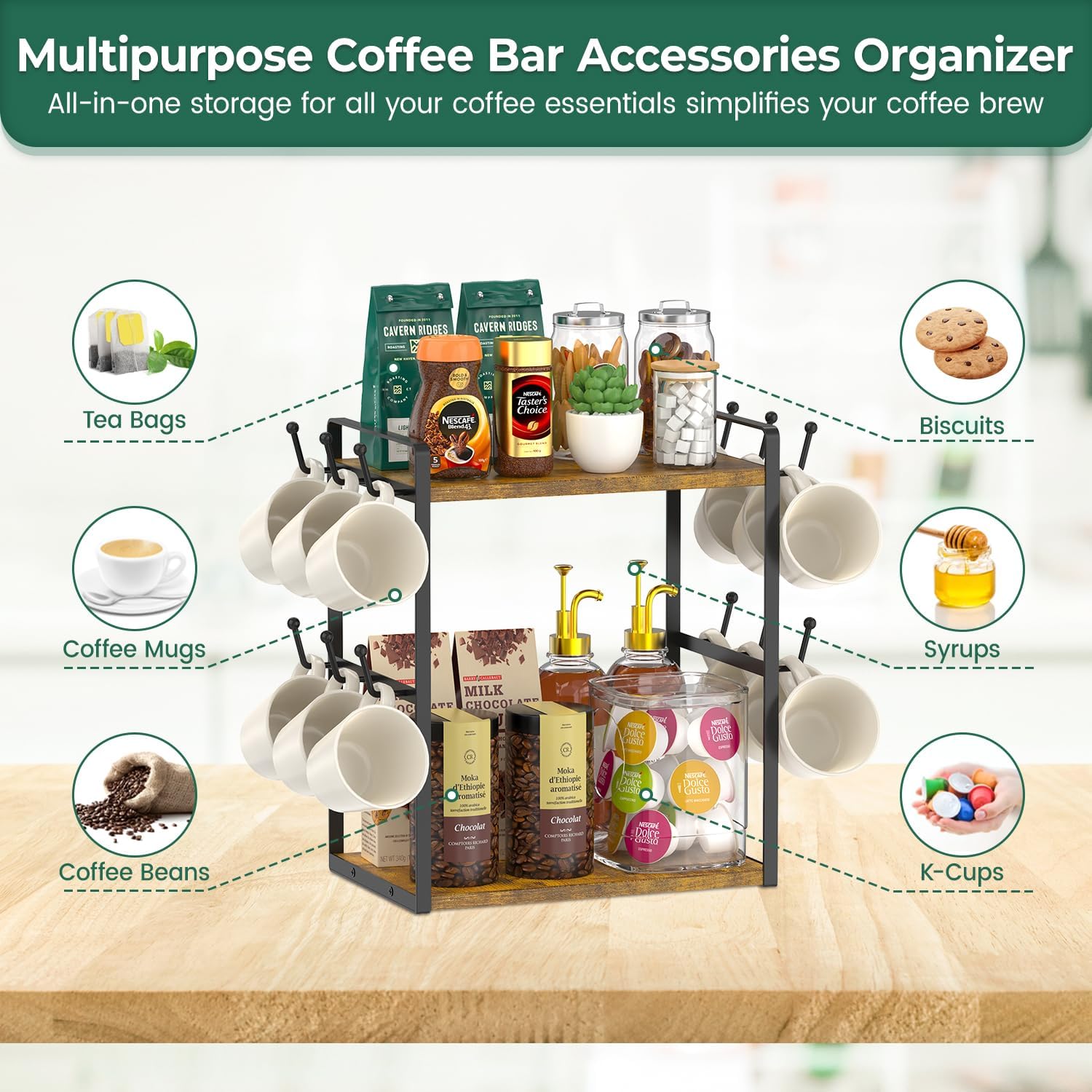 EsLuker.ly 2 Tier Coffee Mug Holder Station Bar Organize Countertop, Mug Cup Tree Rack for Kitchen Office, Storage Shelf with 12 Hooks, Creat Stylish Coffee Corner, Vintage Brown-Black
