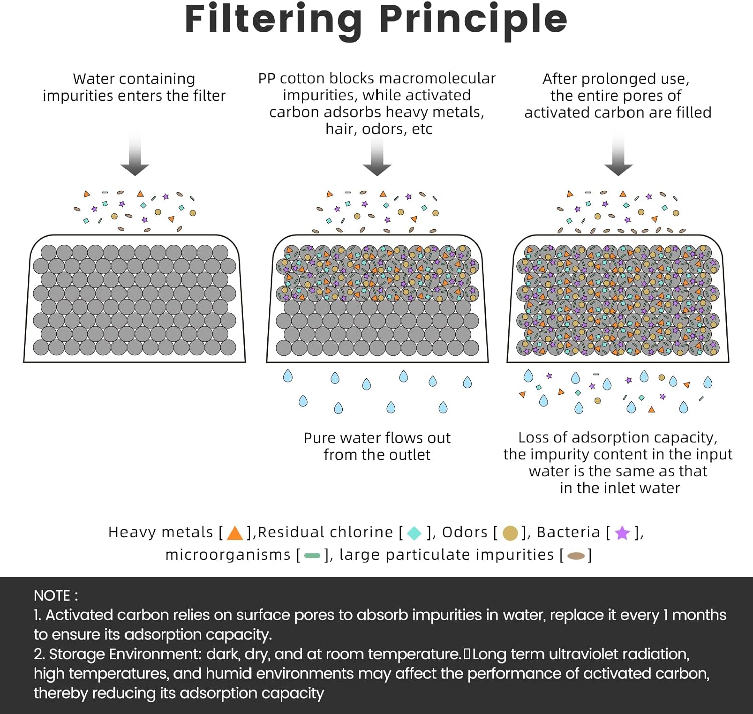 - TECHNOLOGY UPGRADING - After repeated testing, we determined a more suitable thickness of the cotton. The activated carbon particles are wrapped by a dense layer of cotton, and the perfect density can effectively filter water without carbon leakage.