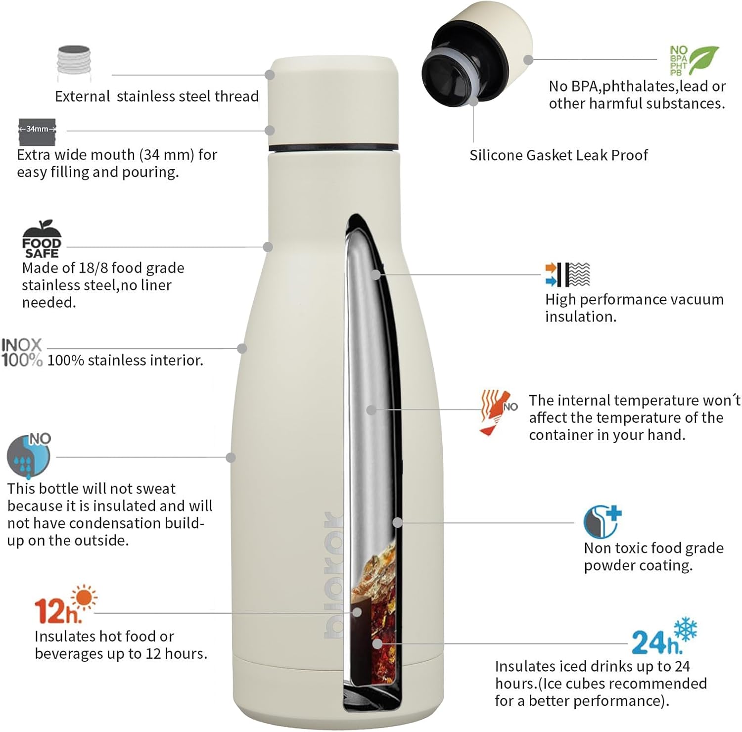 - Keep Drinks Cold & Hot: Adopt double wall vacuum insulation design, keep your drinks ice cold for 24 hours and hot for 12 hours within our highly performed insulated water bottle