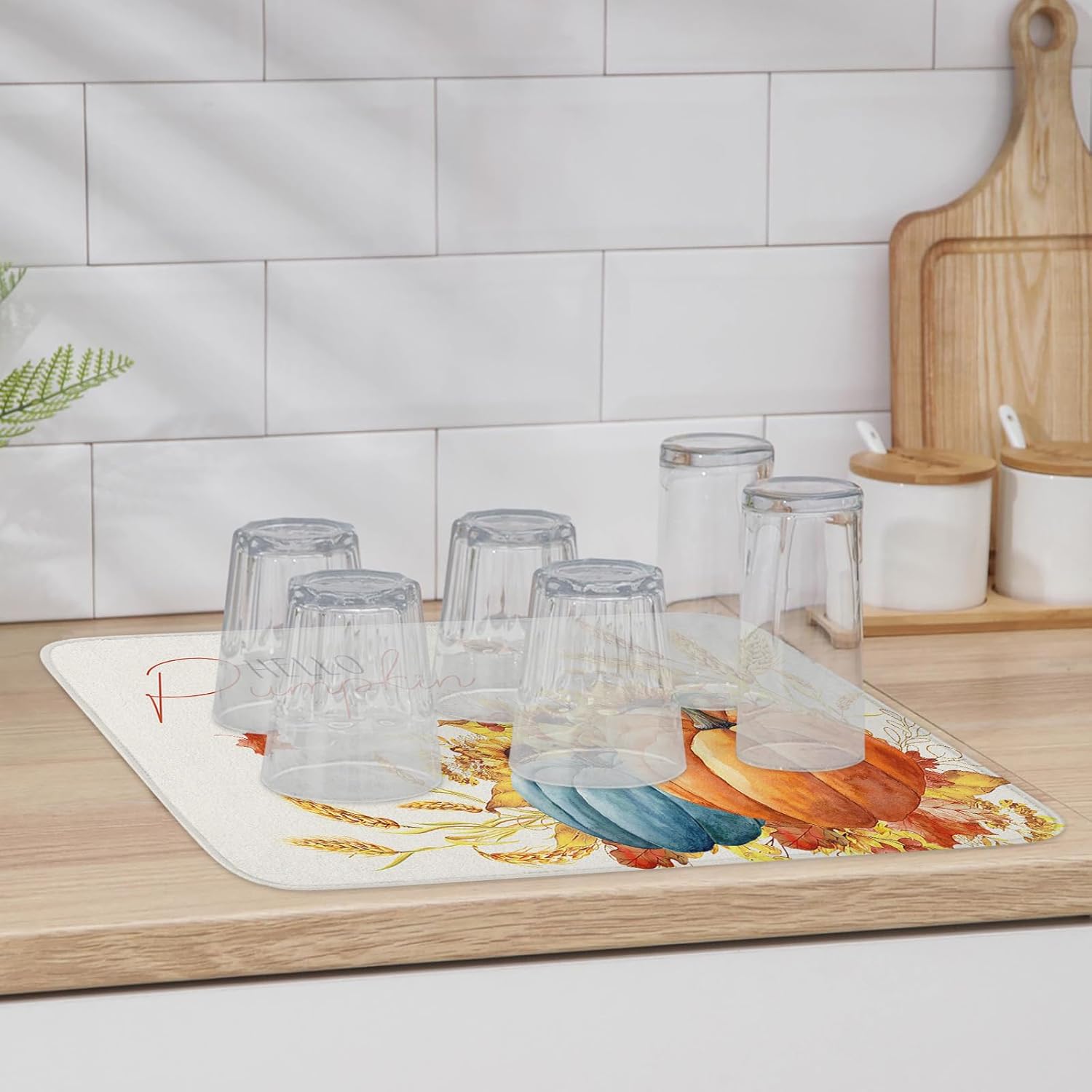 - Fall & Thanksgiving Decor - Pumpkin with sunflower ears of wheat drying mats can add an chic holiday vibe and charm to your kitchen or coffee bar counter. The drying mat for kitchen counter with a unique hanging rope design that can be hung without occupying any space.