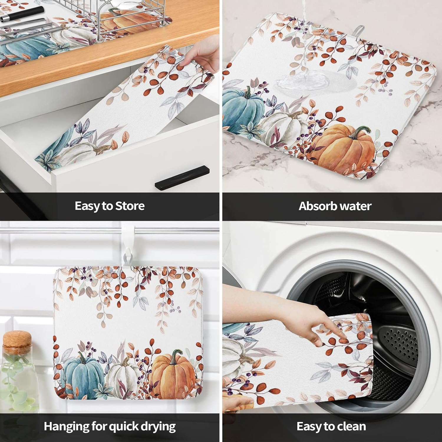 Fall Dish Drying Mat for Kitchen Counter Pumpkin Drying Pad Absorbent Drying Mats for Countertops Sinks Draining Racks Autumn Eucalyptus Leaves Drainer Holiday Harvest Thanksgiving Decorations 16x18