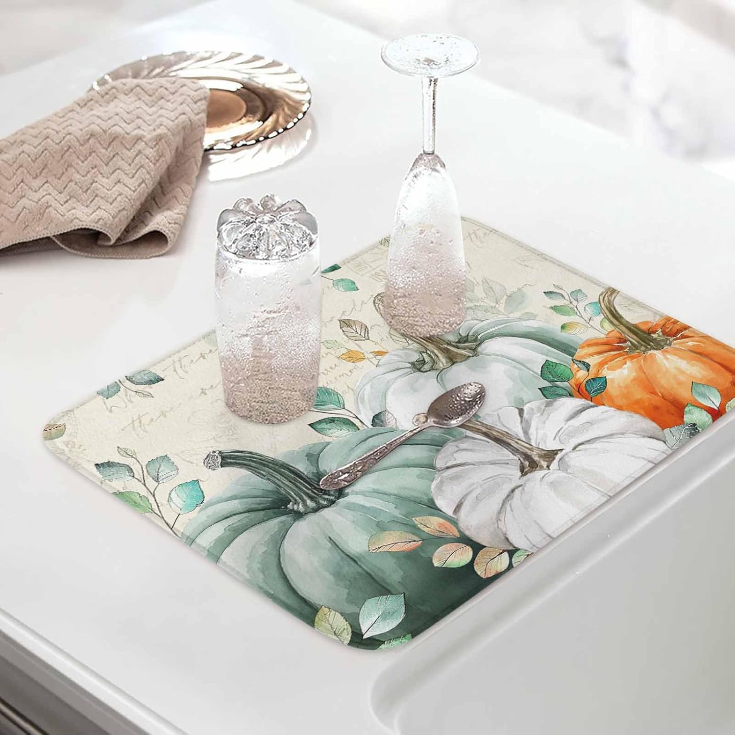 Fall Dish Drying Mat for Kitchen Counter Green Pumpkin Drying Pad Absorbent Drying Mats for Countertops Sinks Draining Racks Eucalyptus Leaves Drainer Holiday Harvest Thanksgiving Decorations 16x18