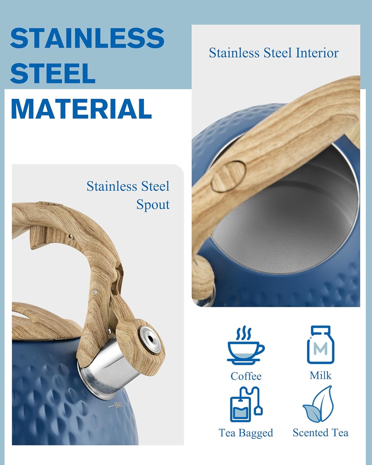 - Large Capacity & Anti-Rust Finish: This stovetop tea kettle has a capacity of 2.5 quarts, perfect for friends gathering. The main body is made of stainless steel, anti-rust and anti-corrosion, thick stainless steel makes it more resilient and strong.