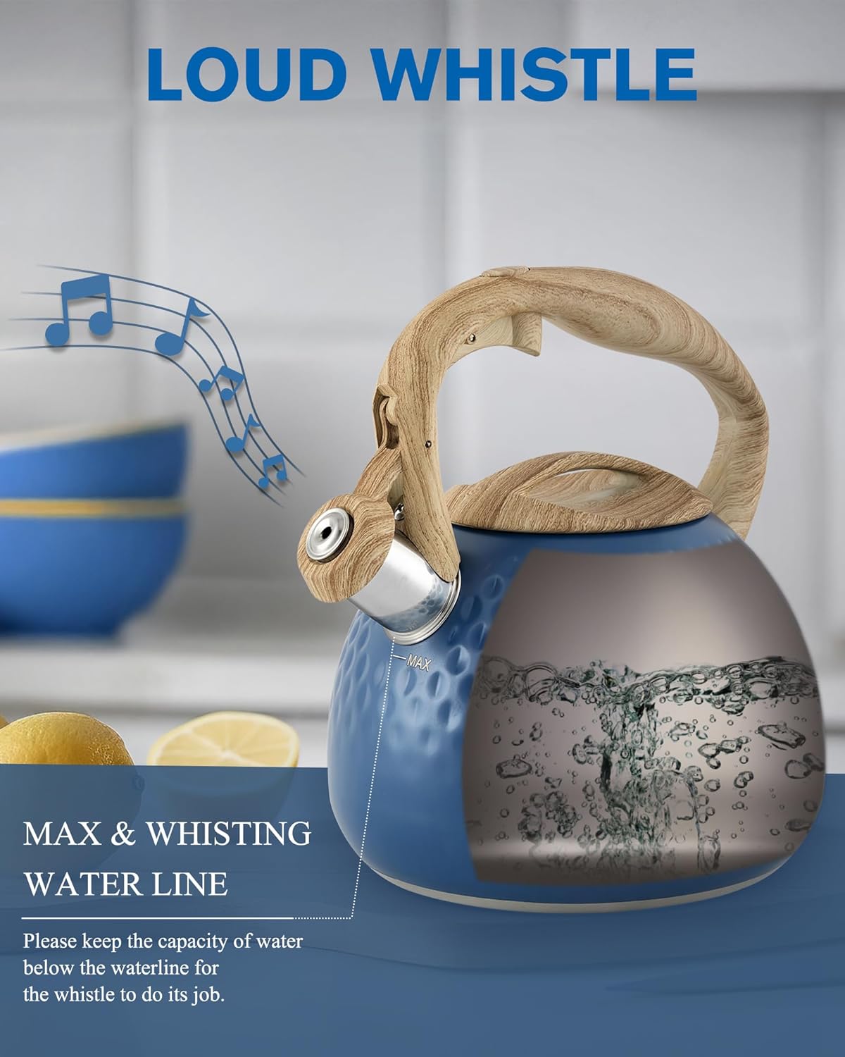 - Loud Whistle: This teapot kettle has a tight-fitting lid that keeps steam in the hot teapot for quick heating, and the teapot will whistle to remind you after boiling water. Do not overfill the jug or the whistle may not sound.