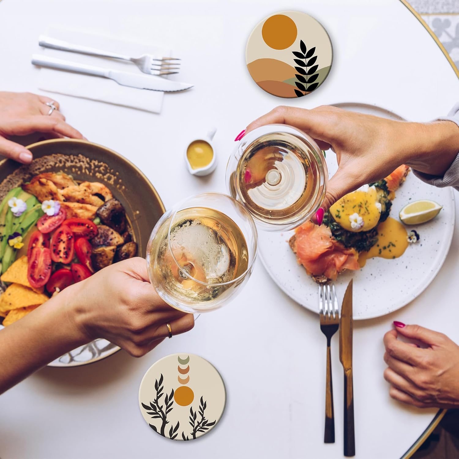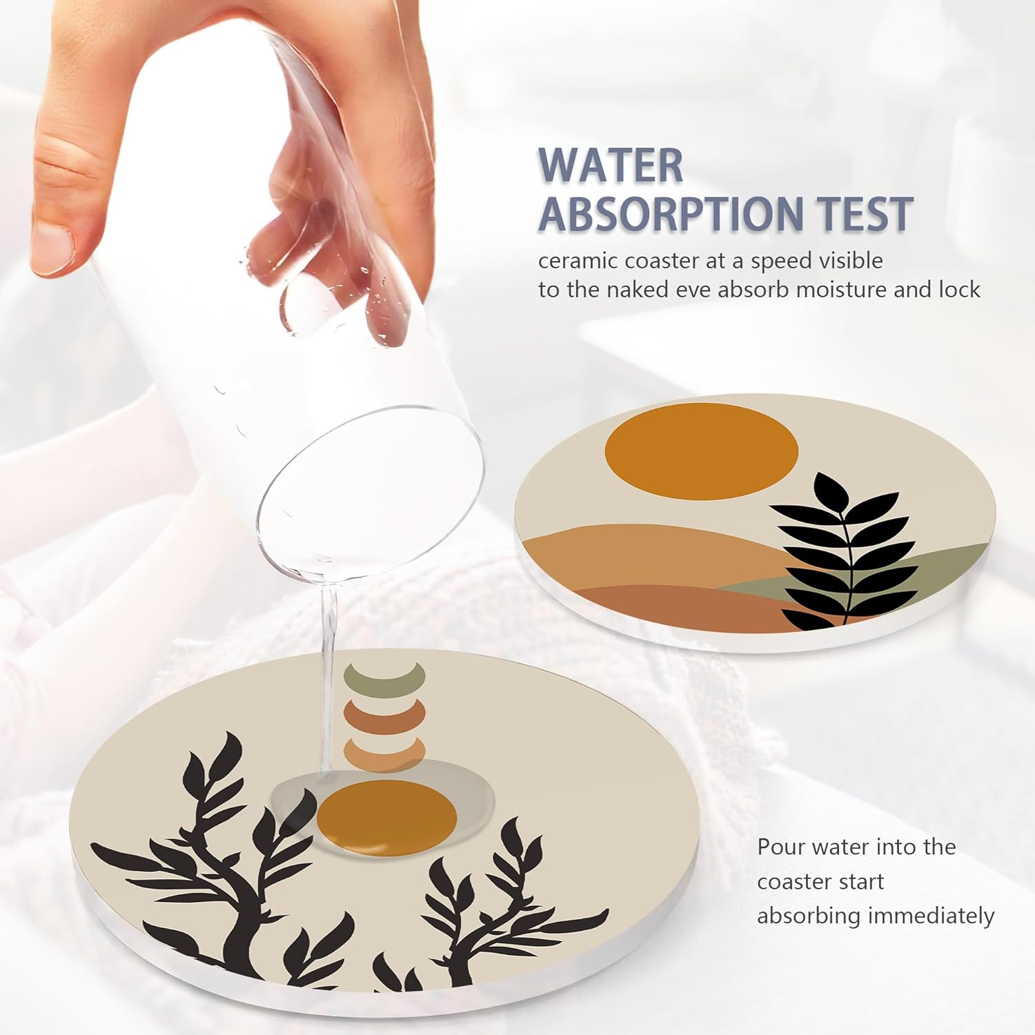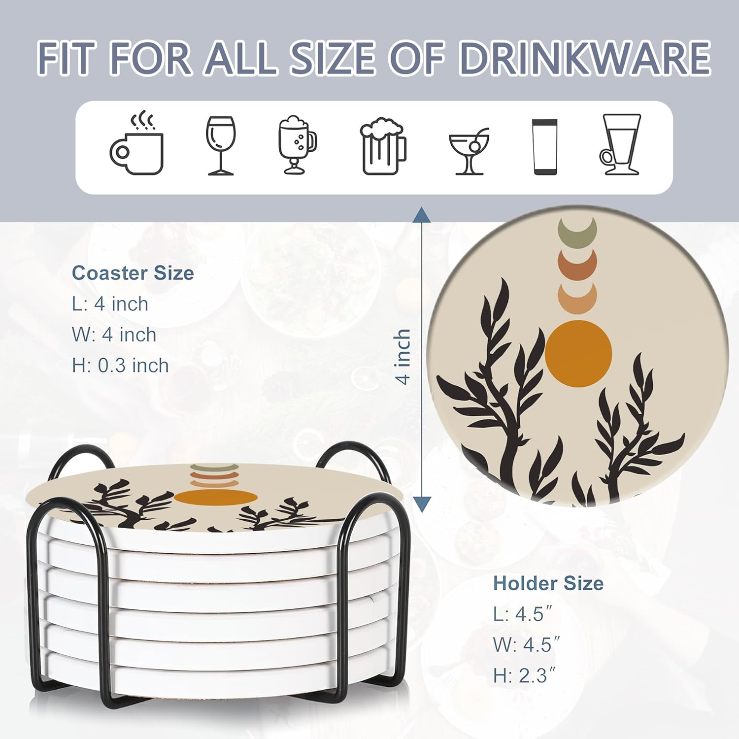 - Husiti Ceramic Coasters Set With Metal Holder: Keep Your Dining Table Stylish And Organized With This Set Of 6 4-Inch Round Coasters Featuring a Trendy Abstract Boho Sun Leaves Pattern.