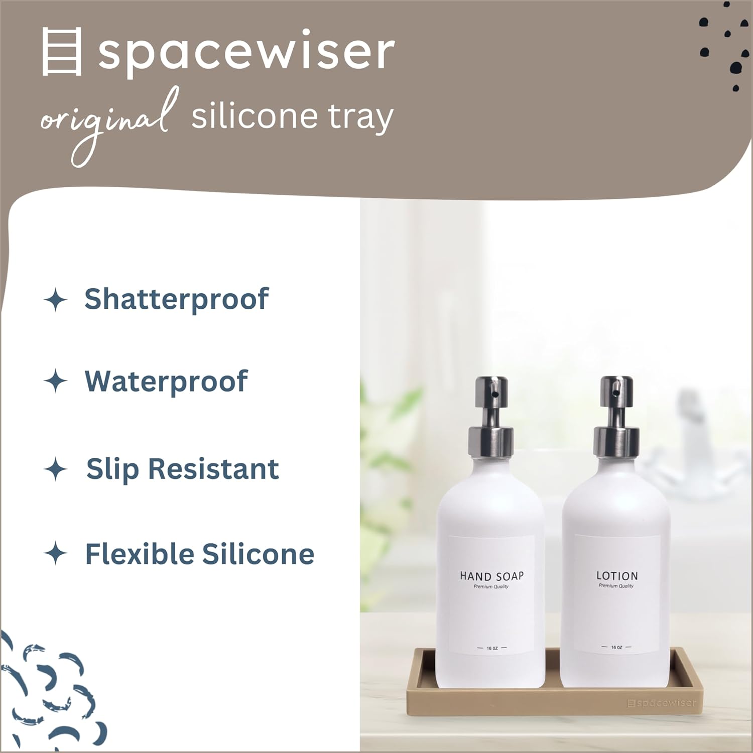 - Use It Anywhere - Choose the endlessly useful and aesthetically pleasing tray that works anywhere. The Spacewiser Original Silicone Tray is perfect as a bathroom tray, vanity tray, soap dispenser tray, kitchen soap tray or sink caddy. The trays are made of premium food grade silicone, without the addition of potentially unsafe thickening agents or chemicals. They’re shatterproof, waterproof, slip-resistant, heat resistant to 425F, and dishwasher safe- a perfect soap dish or sponge holder.