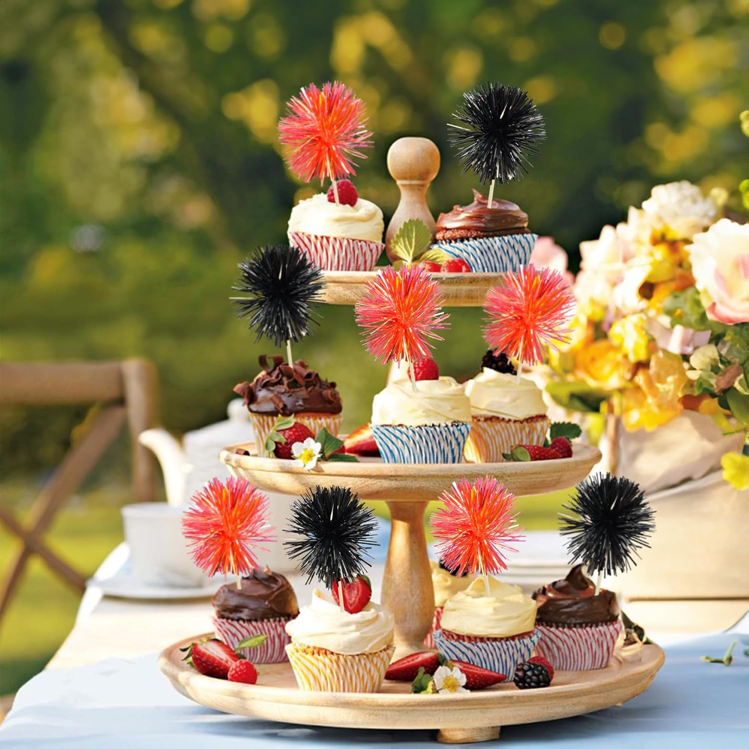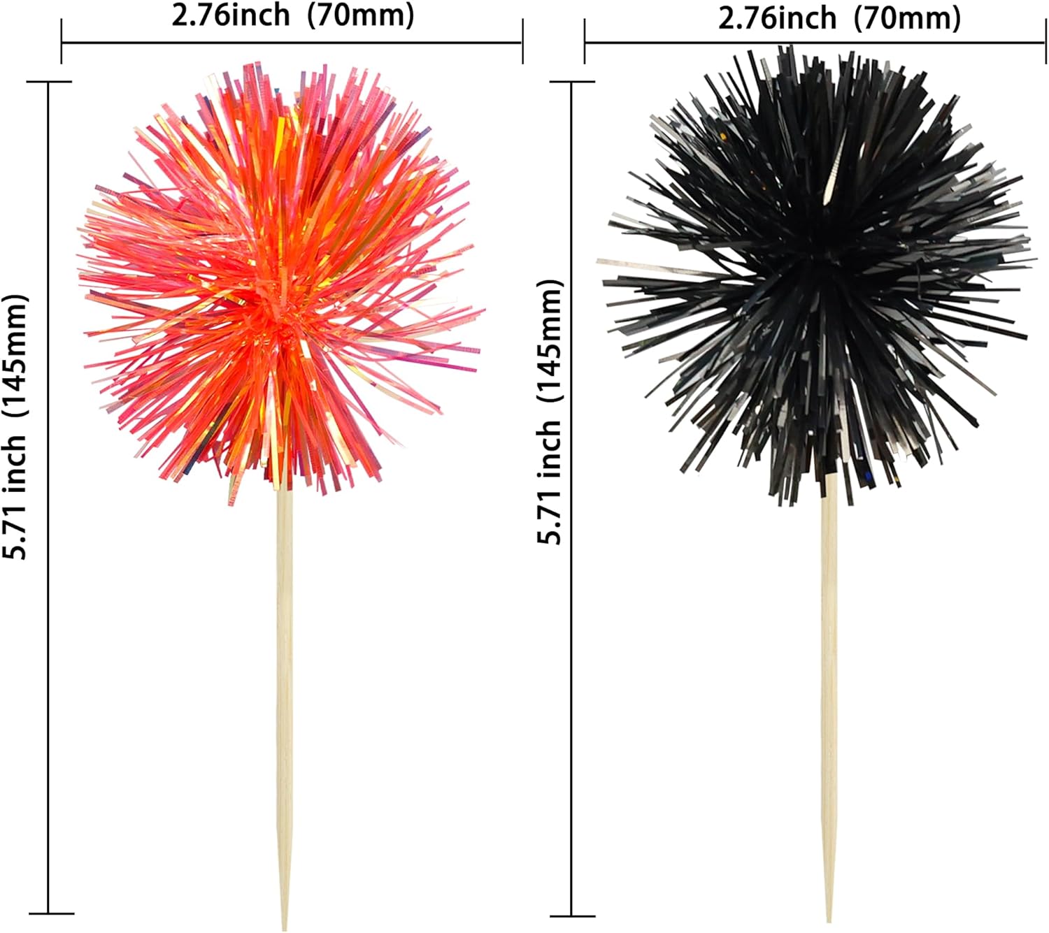 Gyufise 30Pcs Foil Firework Cupcake Toppers Sparkle Tinsel Cake Toppers Tinsel Drink Cake Decoration Cocktail Picks for Birthday Wedding Graduation Party Supplies Black Orange