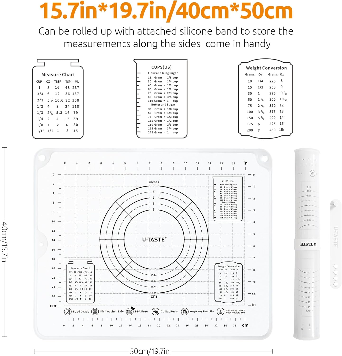 - [Food Grade Platinum Silicone Pastry Mat] U-Taste pastry mat is made of food safe platinum liquid silicone (A real platinum silicone mat must have a filling hole in the back). With no odd smell, it is safe to use with bread making. The measurement on the baking mat is made of silicone, so no worries of painted marks fading and sticking to your food. This kneading mat comes with 2 hanging holes, a rubber band to tie it up and a small packing bag for easy storage. Dishwasher safe as well.