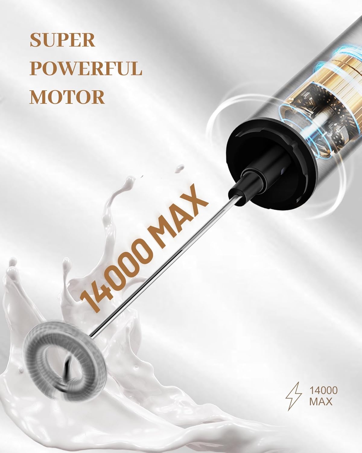 - Powerful Coffee Frother: Engineered by our expert team, it features a high-power turbocharged motor with a maximum speed of 13,000 RPM ±10%. It can whip up smooth, delicate coffee in just 15 seconds. For morning coffee enthusiasts, this elegant frother lets you top your coffee with velvety foam at lightning speed, even on the busiest mornings
