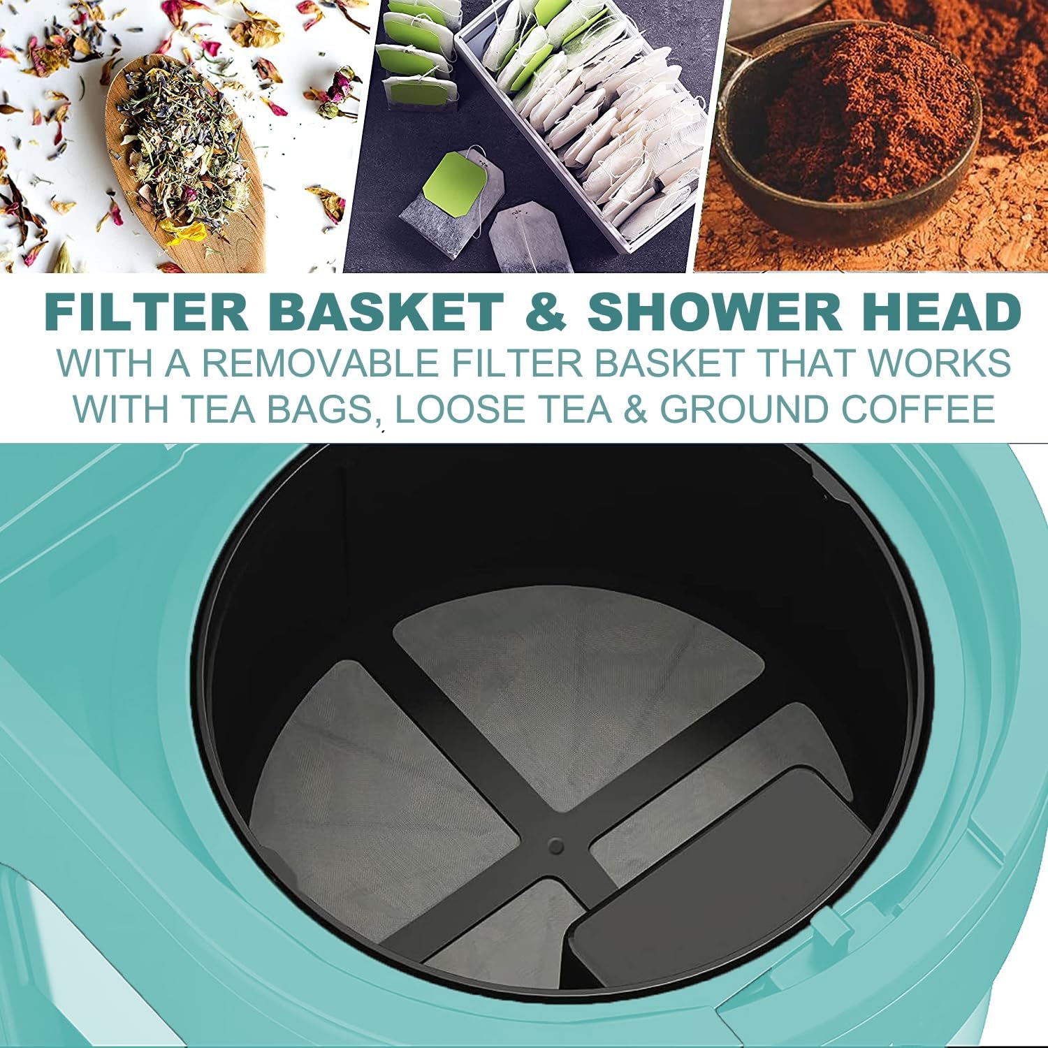 - 【Filter Basket & Shower Head】The removable filter basket works with fresh ground coffee, tea bags and loose leaf teas, while the shower head is designed for complete saturation and optimal flavor extraction.