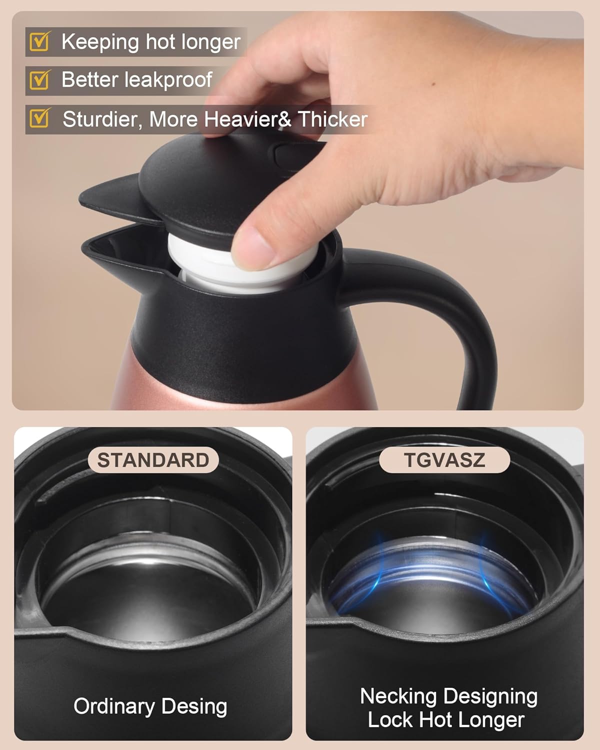 - ERGONOMIC & EASY TO USE WATER CARAFE >>>> Our flask tea with one-hand pouring your hot drinks come out with ease whether it be hot tea, cold milk, juice or mulled wine. It's safe to touch the stainless steel coffee carafe exterior body either it is a hot or cold beverage inside, as the temperature is locked in and the thermo flask body stays cool. Our coffee crafts to keep coffee hot is non-slip base keeps the insulated carafe right where you placed on it.