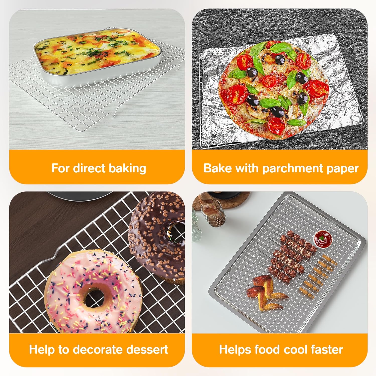 - UNIQUE PRODUCT DESIAGN: The one-piece 4 raised feet of baking rack are specially designed to allow for optimal air circulation, making food crispier after cooling. More suitable grid spacing prevents food placed on it from falling or deforming.