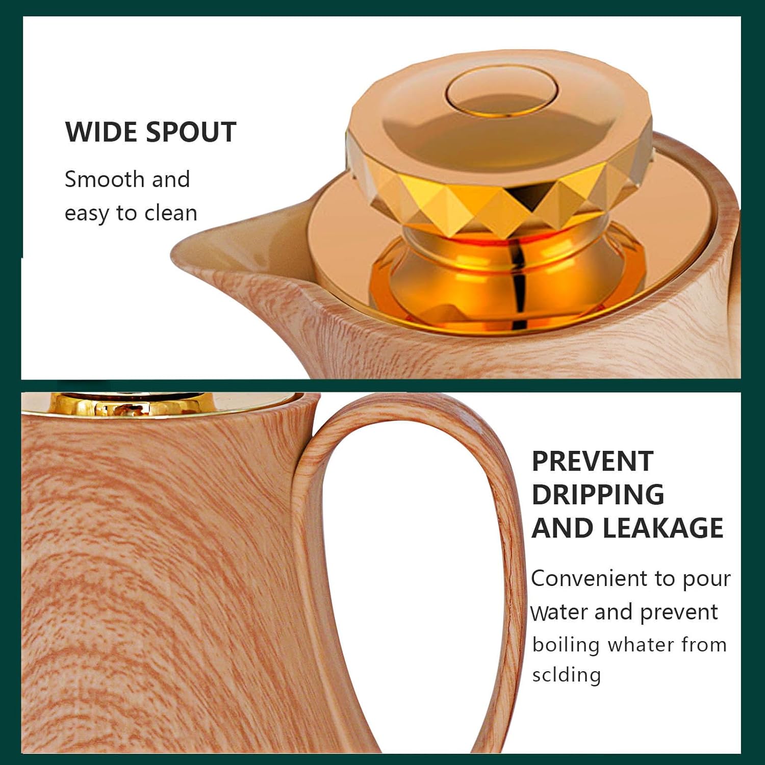 Insulated Thermal Coffee Carafe, 33 oz, Luxury Arabic-Style Insulated Carafe Flask, Coffee Tea Pot, with Spout and Glass Liner for Hot Cold Water, Housewarming Ornaments (Wood Color)