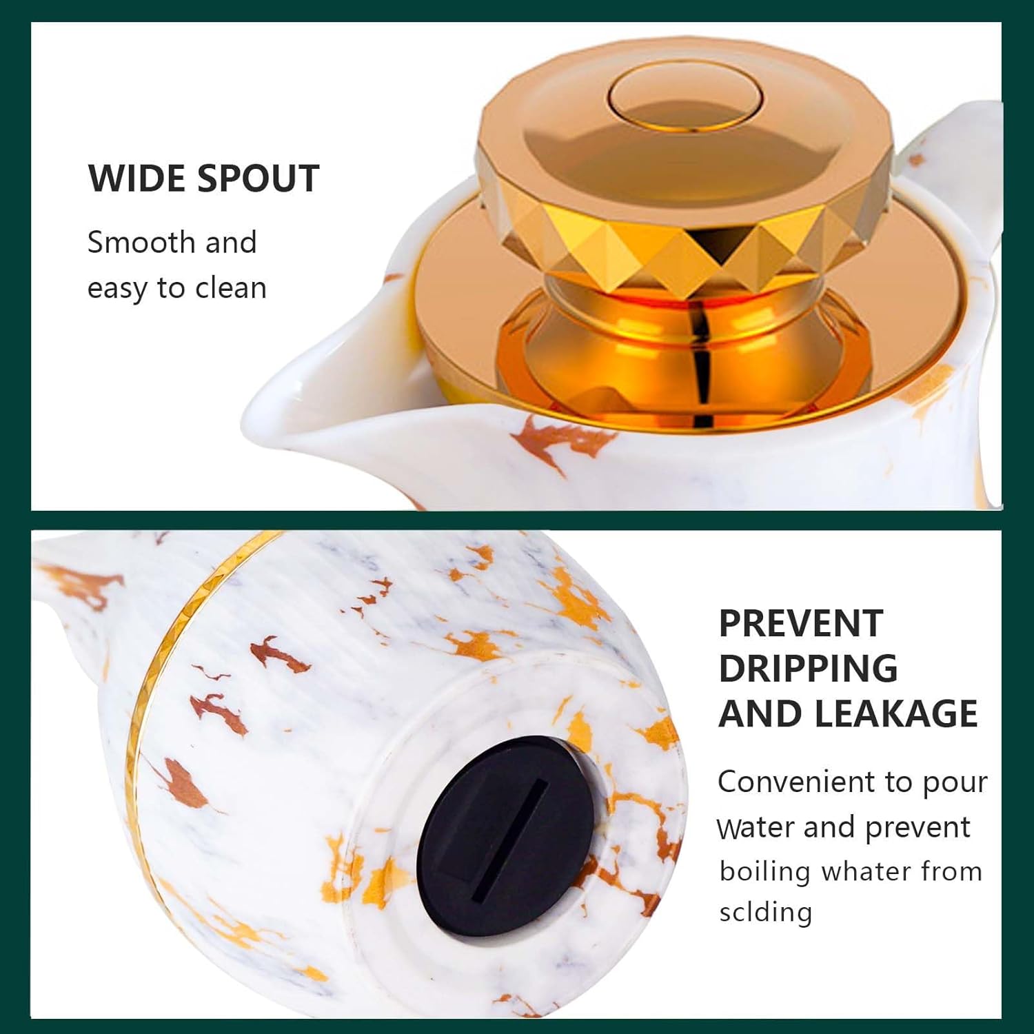 - 【Premium Materials】This carafe for hot water comes with a premium quality, ABS plastic outer body that does not sweat, is rust proof and gives the vacuum carafe lasting durability. It features a leak proof lid that prevents any drips and locks in freshness of your drinks.