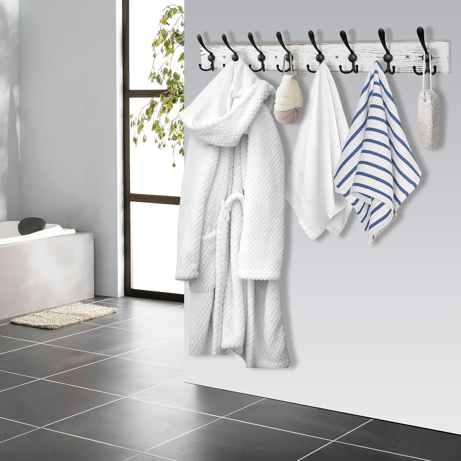 - [Package & Size]: PACKAGE: 1 x old white pine plank, 8 x black triple-hooks, 16 x short screws, 4 x long screws, 4 x drywall anchors, 1 x installation instruction. SIZE: 32.2'' (L) x 4.7'' (W) x 2.9'' (Thick).