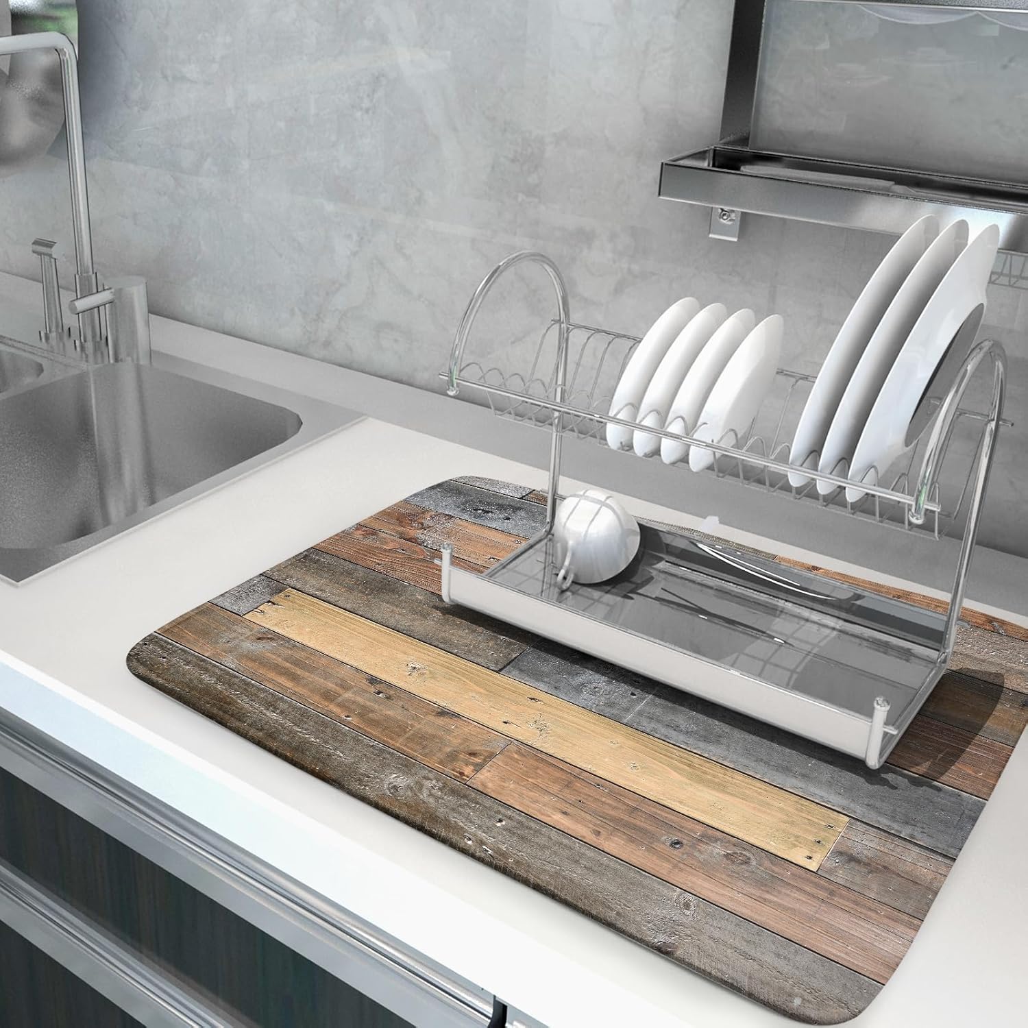 Giwawa Wood Grain Dish Drying Mat for Kitchen Countertop, Rustic Wooden Board Dish Drainer Mats, Vintage Country Style Barnwood Absorbent Reversible Microfiber Dish Drying Pad, 18x24 inch Large