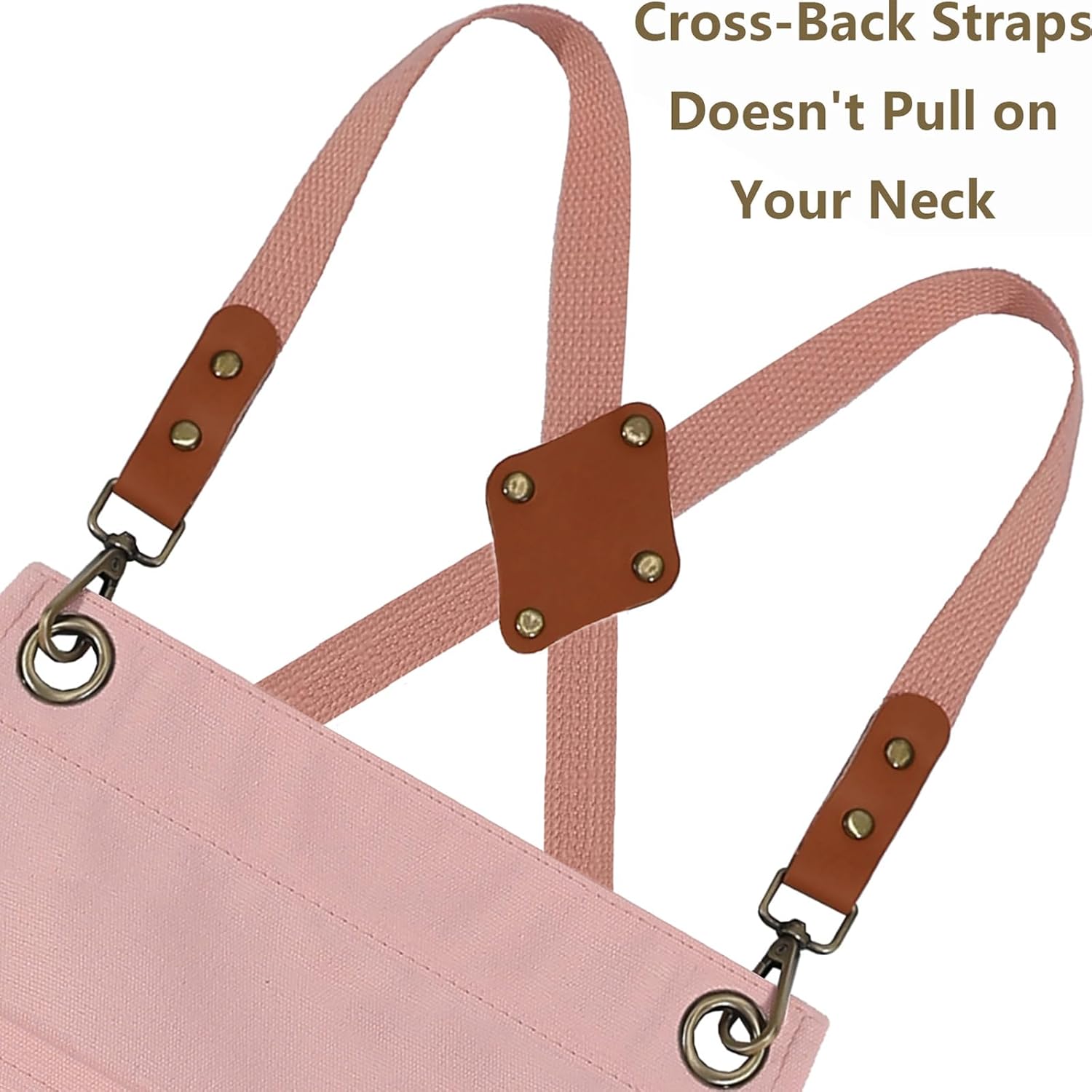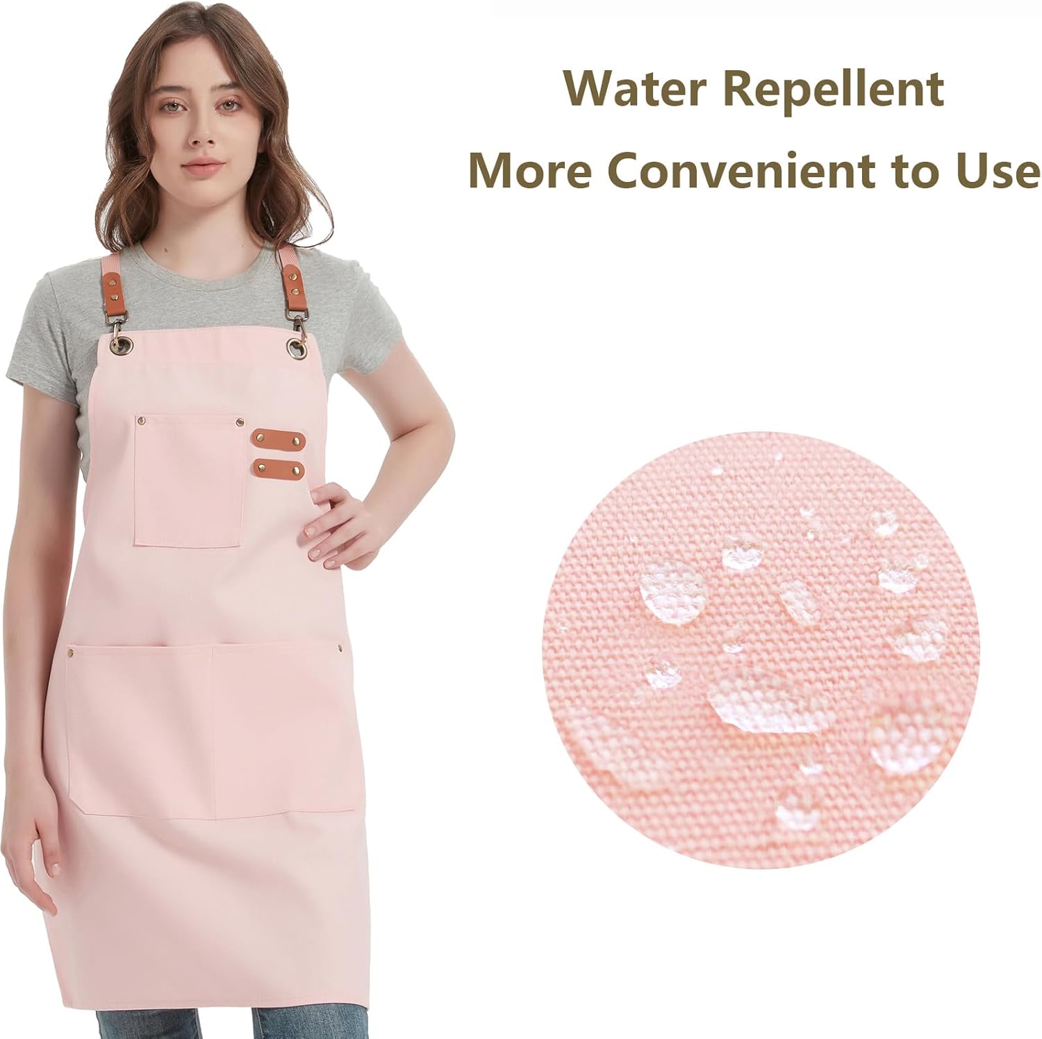 AFUN Chef Aprons for Women Men with Large Pockets, Cotton Canvas Cross Back Water Repellent Work Apron, Size M to XXL (LightPink)