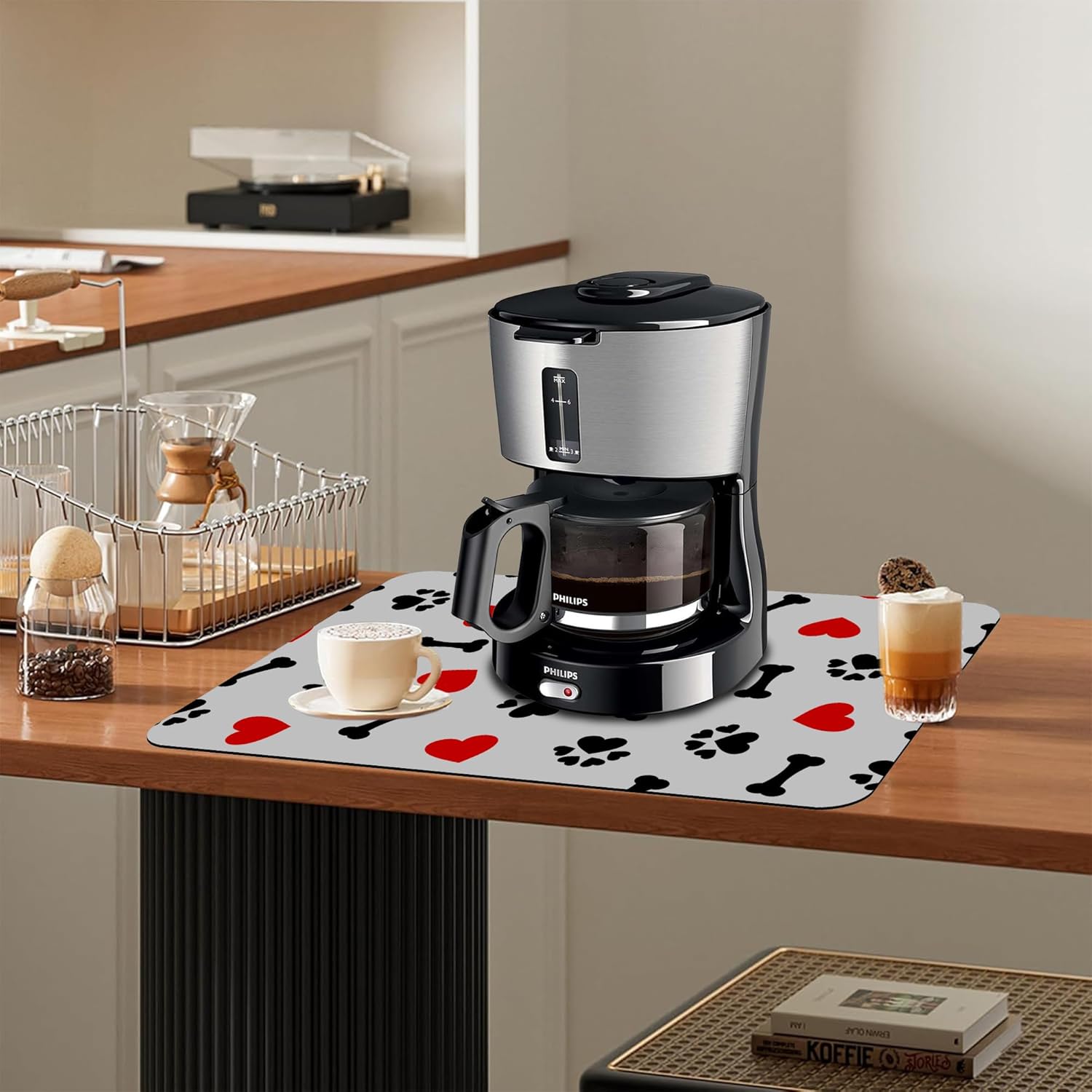 Dish Drying Mat Cute Dog Bone Paw Print Red Heart Kitchen Mat 16"x24" Bsorbent Coffee Maker Mat for Dishes,Utensils Coffee Maker Pots and Pans Easy Clean Dish Slip Resistant Pad