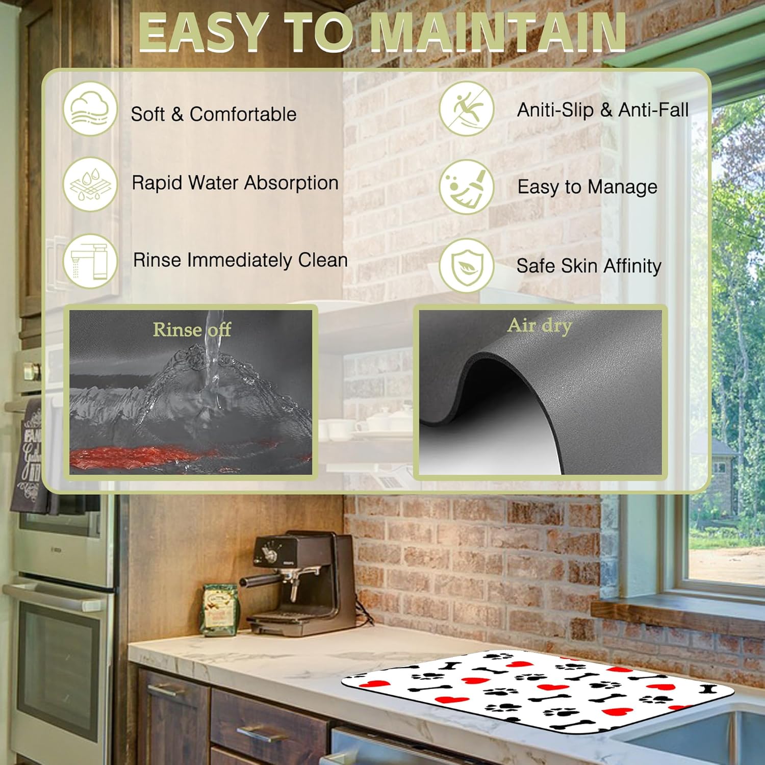 - Material and sizes:This kitchen mat is made of absorbent suede,diatom mud and non-slip rubber,two sizes:12" X 19" and 16" X 24" it fits most counters