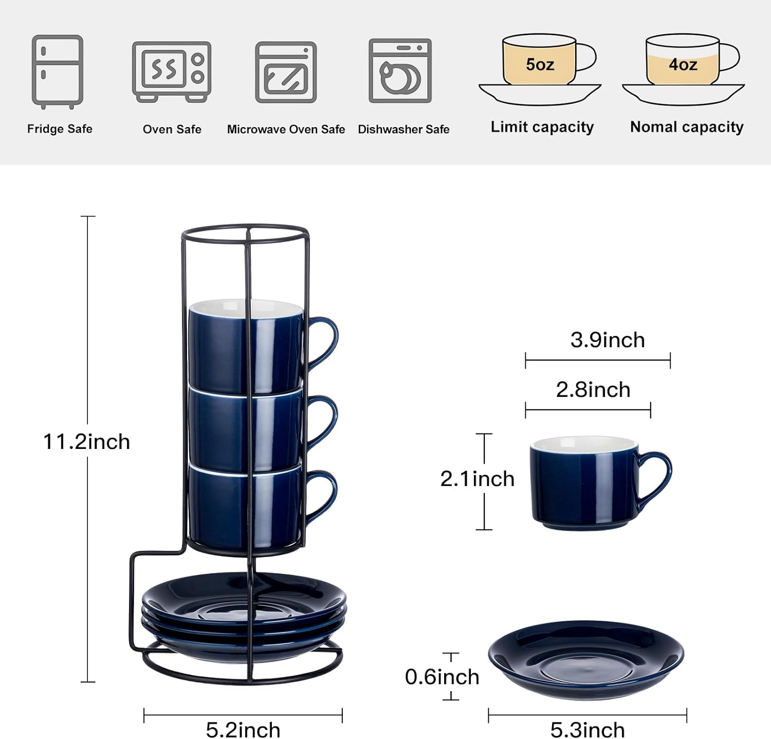4oz Porcelain Stackable Espresso Cups with Saucers and Metal Stand Set of 4, Stackable Cappuccino Cups, Blue Expresso Shots Cup Set for Coffee Drinks, Latte, Americano, Tea