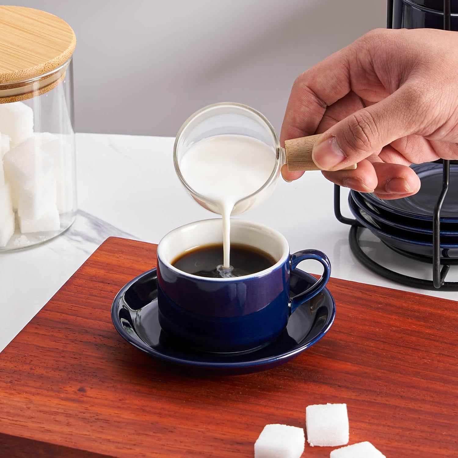 - 1.Elevate your kitchen experience with the MEICHU Espresso Cups Set. This set includes 4pcs 4 Ounce Espresso Cups with Saucers and Metal Stand, all in a classic blue color. Perfect for people who enjoy coffee and conversation!