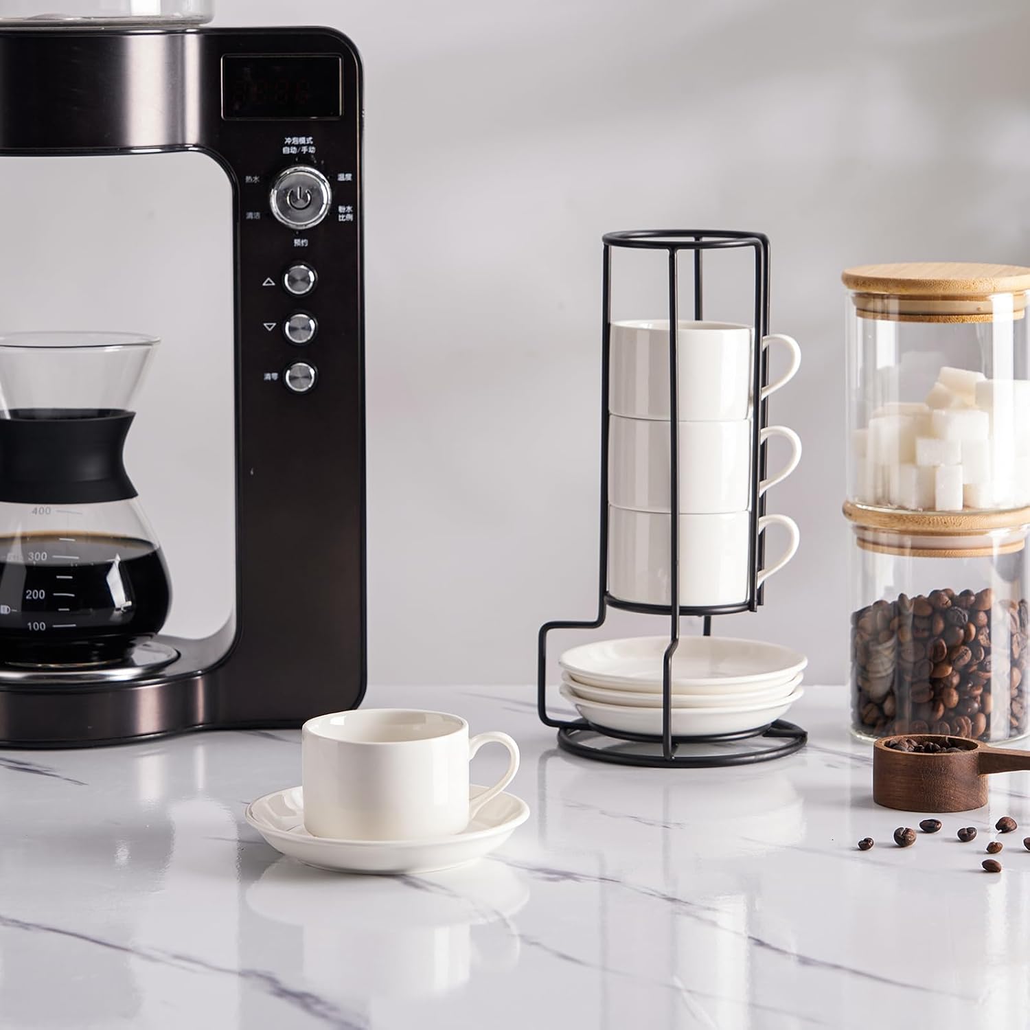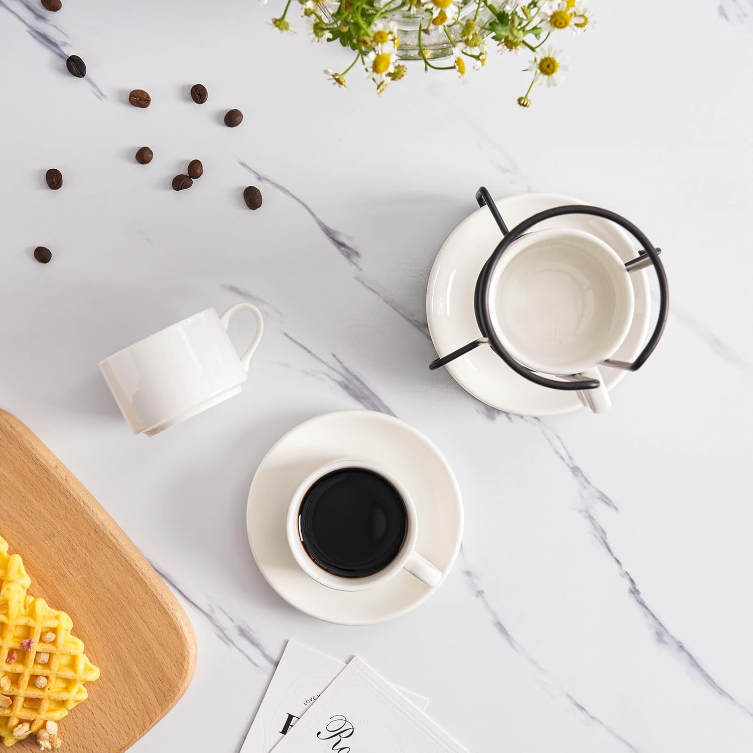 4oz Porcelain Stackable Espresso Cups with Saucers and Metal Stand Set of 4, Stackable Cappuccino Cups, White Expresso Shots Cup Set for Coffee Drinks, Latte, Americano, Tea