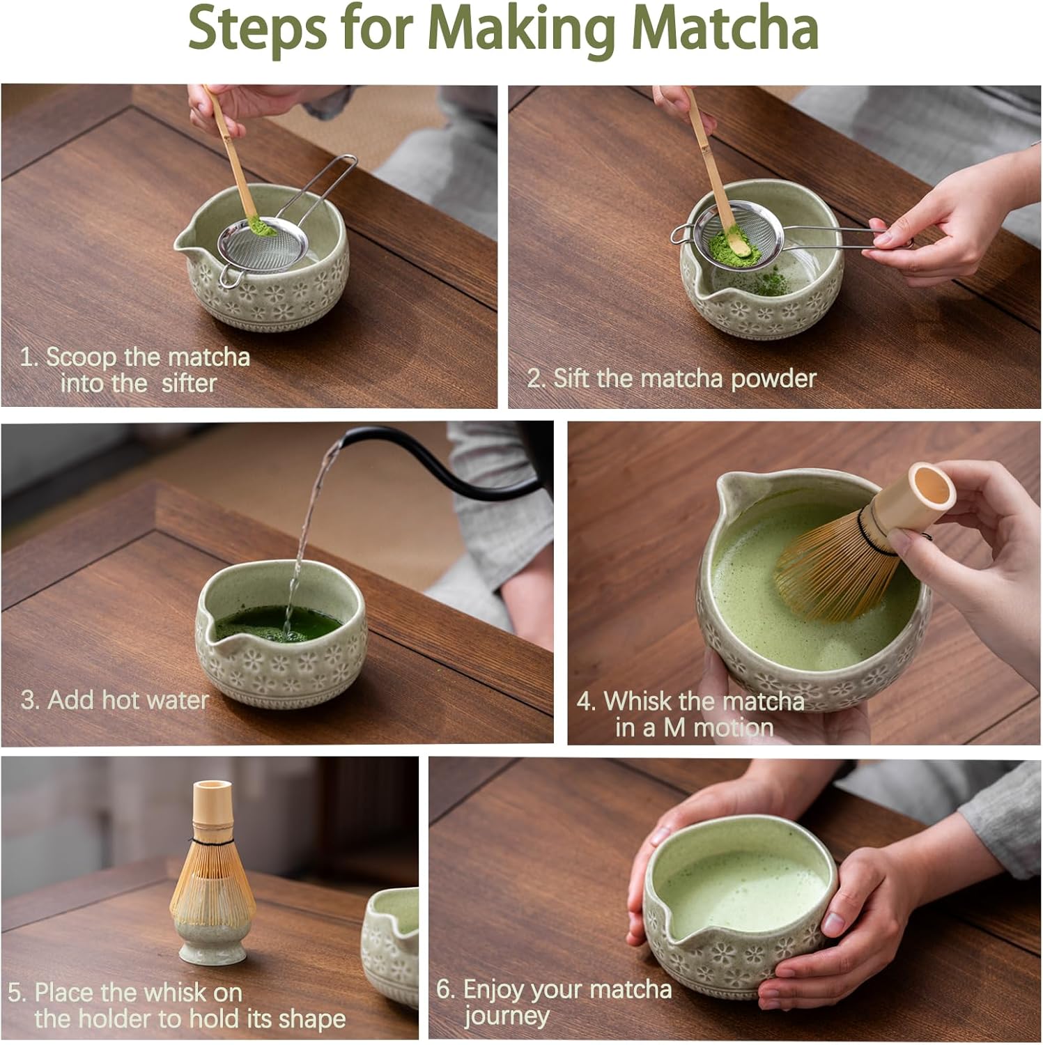 - Complete Matcha Kit: This matcha kit includes essentials for an authentic matcha experience: 1* Bamboo Matcha Whisk, 1* Bamboo Scoop, 1* Scoop Rest, 1* Stainless steel sifter, 1* 530 ml/18 oz Ceramic Matcha Bowl (Chawan), 1* Whisk Holder, 1* Cherry blossoms Tea Towel and 1* Hand book. Each tool is crafted with precision, designed to make your matcha lifestyle effortlessly stylish.