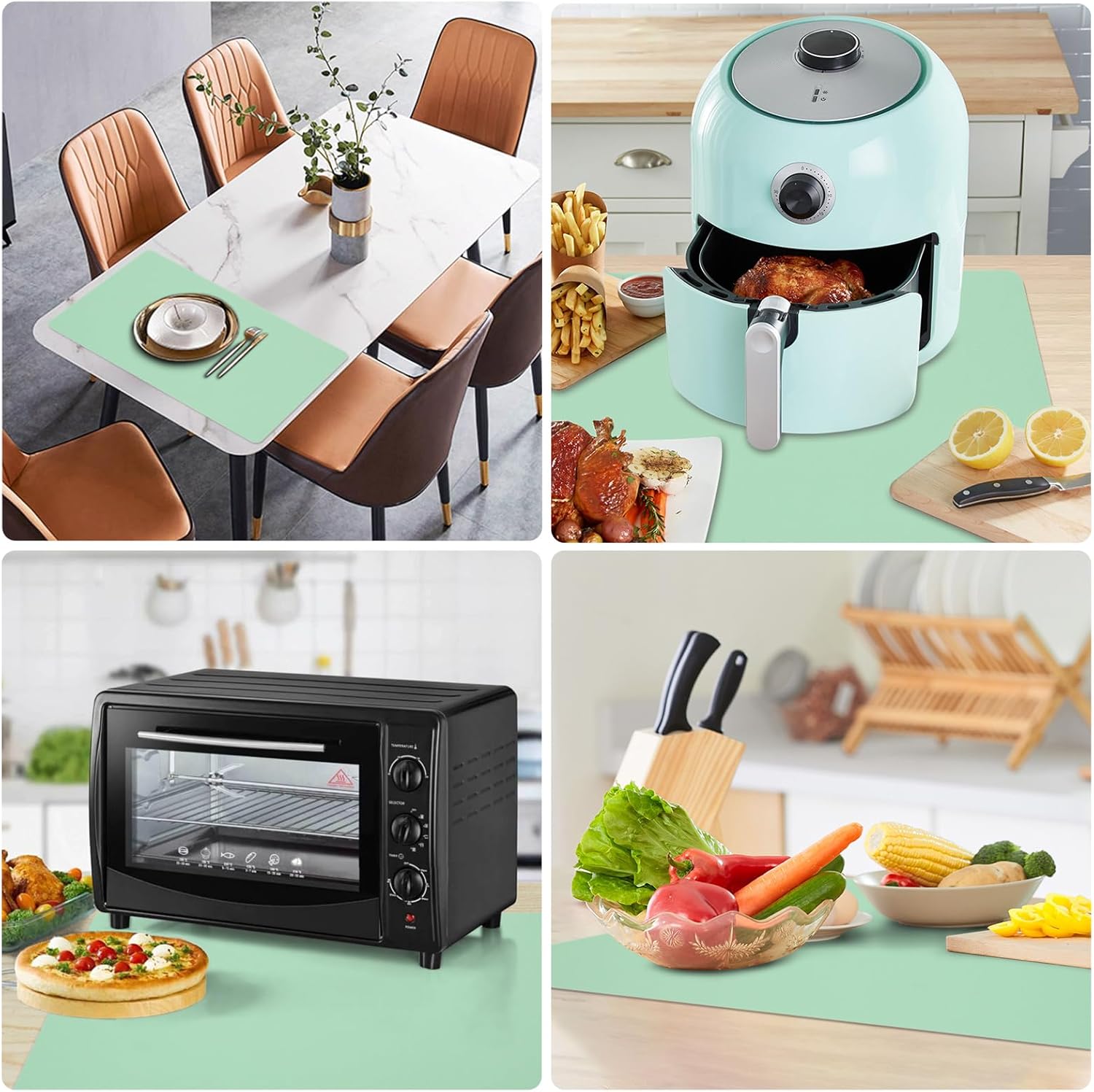 - Extra large silicone mat: Size of 36” x 24”, almost can fit most kitchen countertops, dining tables and other workbench. It can be placed under the air fryer, microwave, toaster oven, induction stove, coffee maker to protect the kitchen countertops and other surfaces against spills, scratches, grease, heat, etc. It’s cuttable to fit different sizes and shapes.