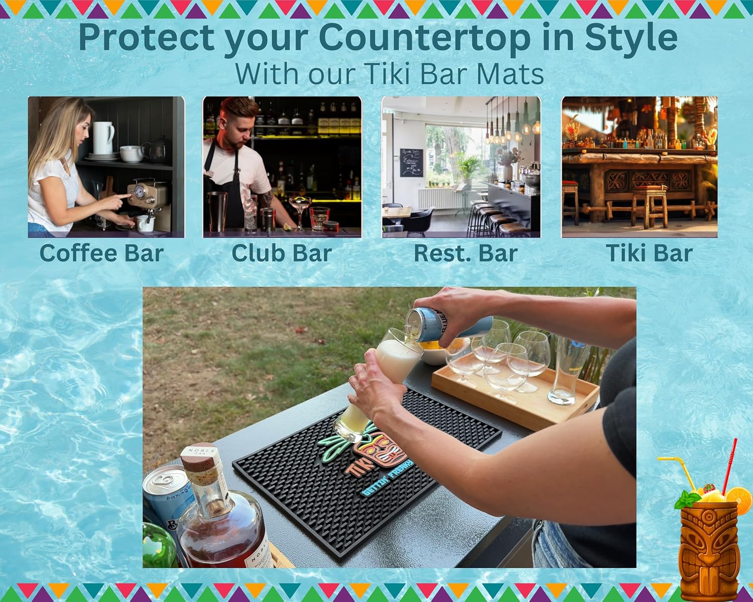 - Tiki-tastic Bar Essential: This unique bar mat features a Tiki Man Warrior's Head with the catching phrase Gettin' Freaky At The Tiki, making it the ultimate piece for tiki decorations bar essentials and bar mats for bartending.
