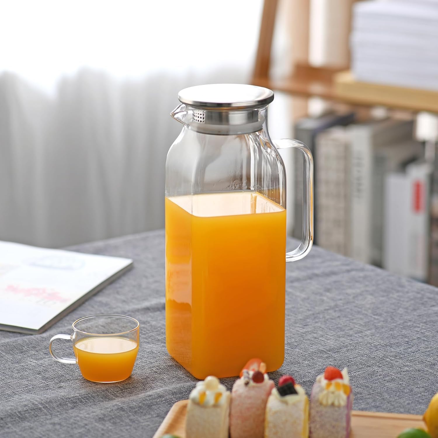 - 2. Designed For Homemade Beverages: This glass pitcher comes with a dual opening stainless steel lid, which can be adjusted as you like, making it easy to retain pulp and ice cubes or pour beverages quickly. The drip-proof spout and ergonomic handle make pouring a breeze, and the food-grade silicone around the lid fits snugly against the body of the jug to avoid wetting the countertop.