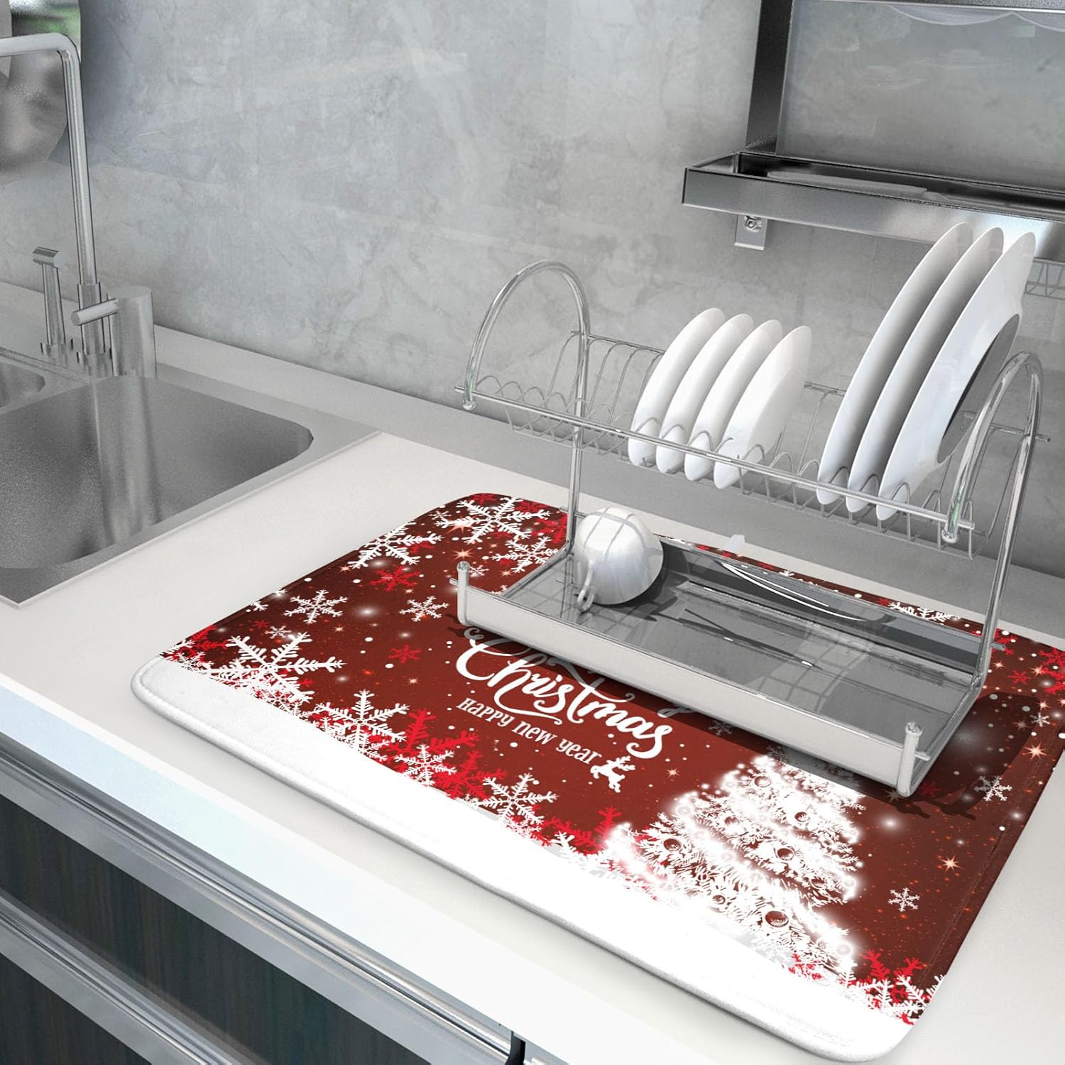 Happy New Year Red Dish Drying Mat for Kitchen Counter,Merry Christmas Tree Snowflake Drying Mat 18 x 24 Inch with High Absorbent Reversible Microfiber Dish Drying Pad Drainer Mat for Coffee Bar