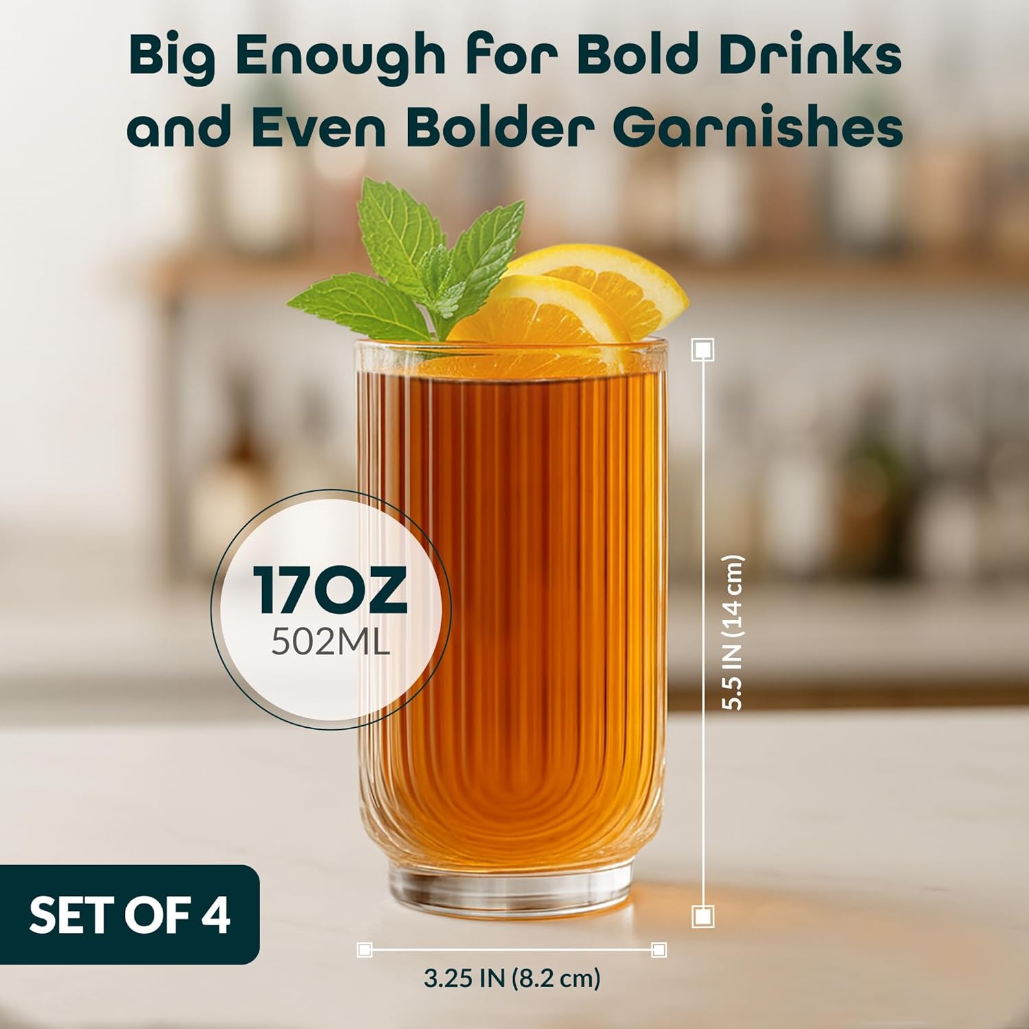 Glaver's Drinking Glasses Set of 4. 17oz Vintage Ripple Cocktail Glasses, Ribbed Highball Glass Cups. Arch Designed Art Deco Glassware for Water Juice Coffee.