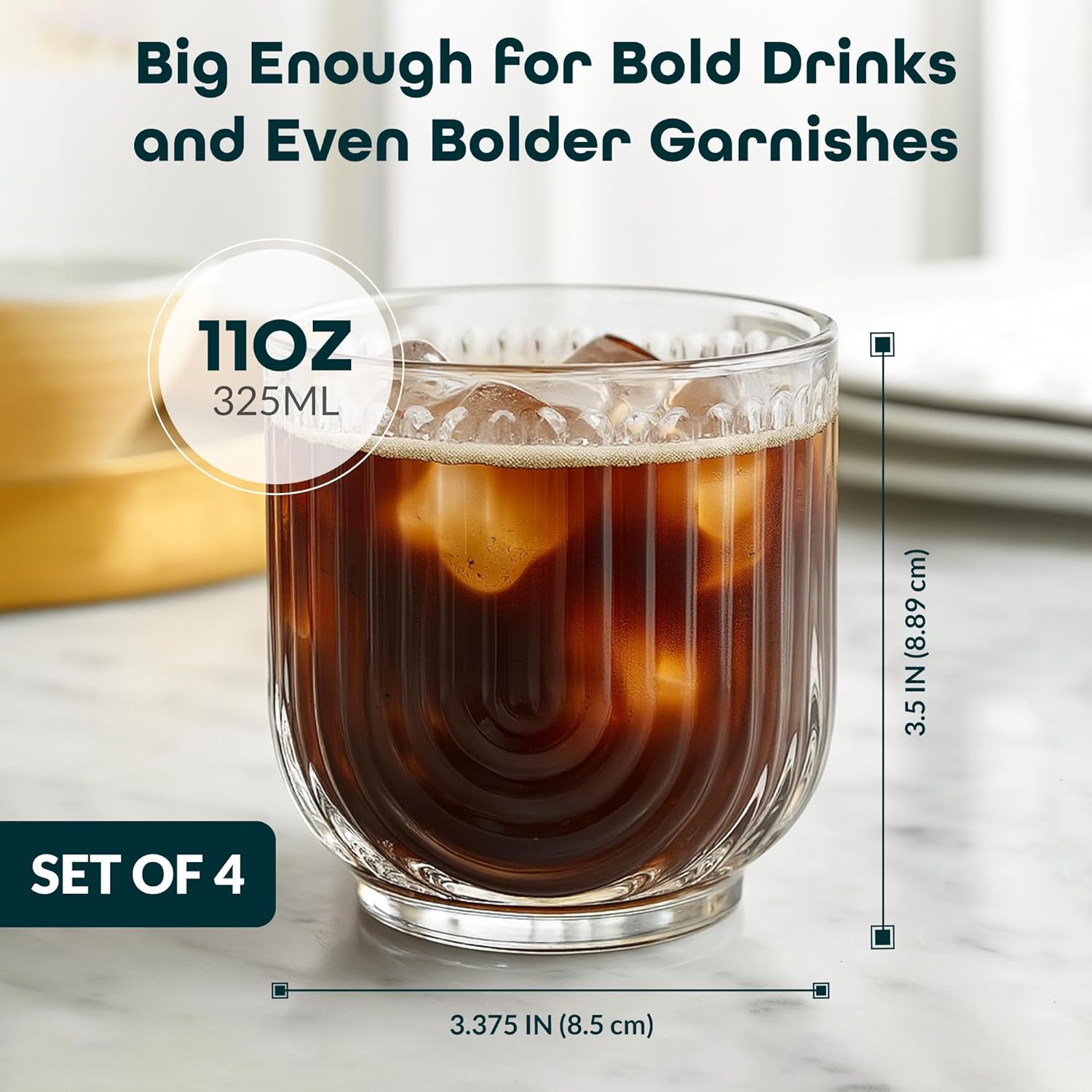 - 🔁VERSATILE: Each DOF glass holds 11 oz (325 ml), perfect for serving Whiskey, Scotch, Cocktails, Bourbon with Bar Ice, Juice, Soda, Smoothies, or any other chilled beverage. The glass is big enough for layered drinks and to showcase your designed garnish.