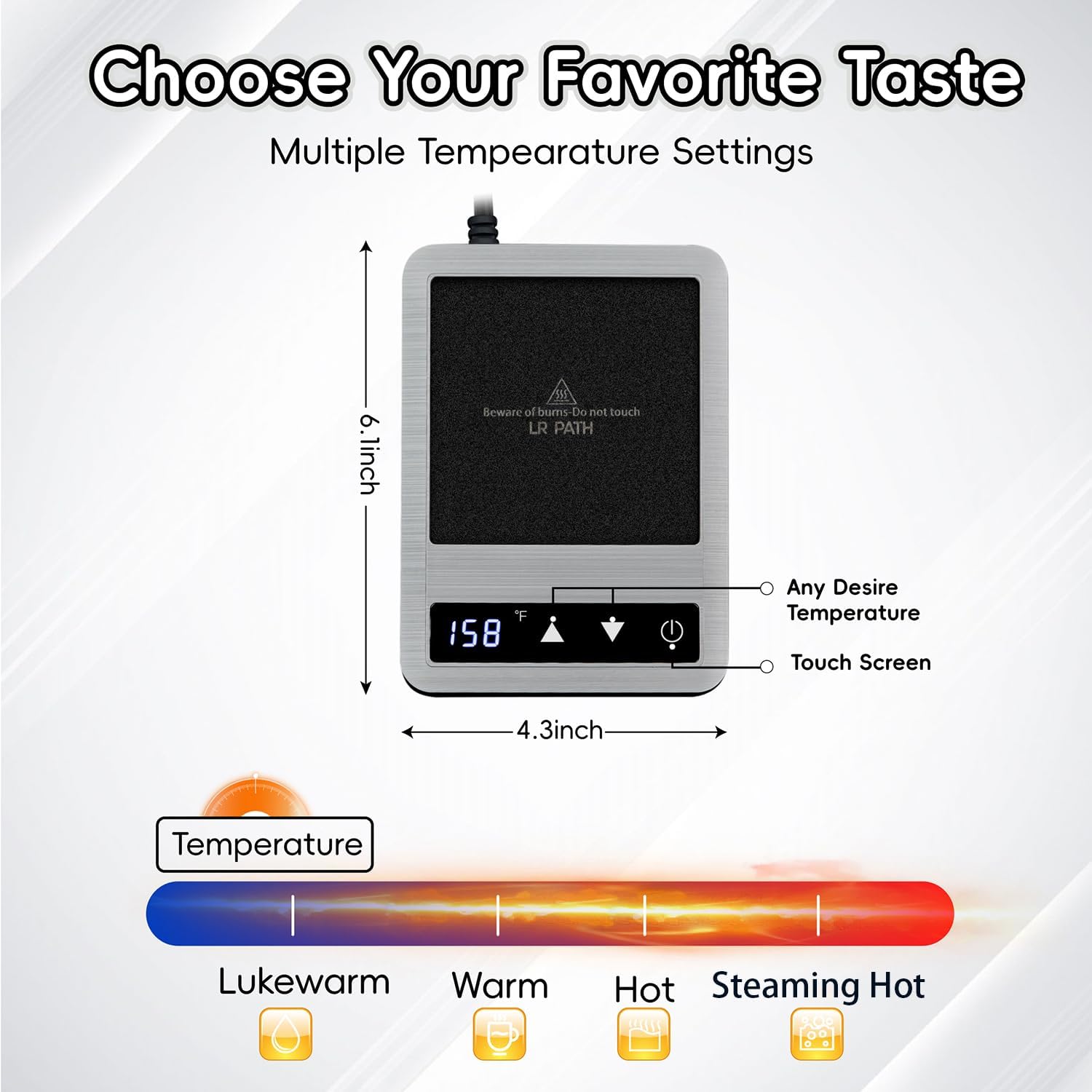 - Customize Your Heat Setting: Choose from 4 temperature options (lukewarm-104℉, warm-122℉, hot-140℉ or steaming hot - 158℉) to suit your preferred beverage and taste