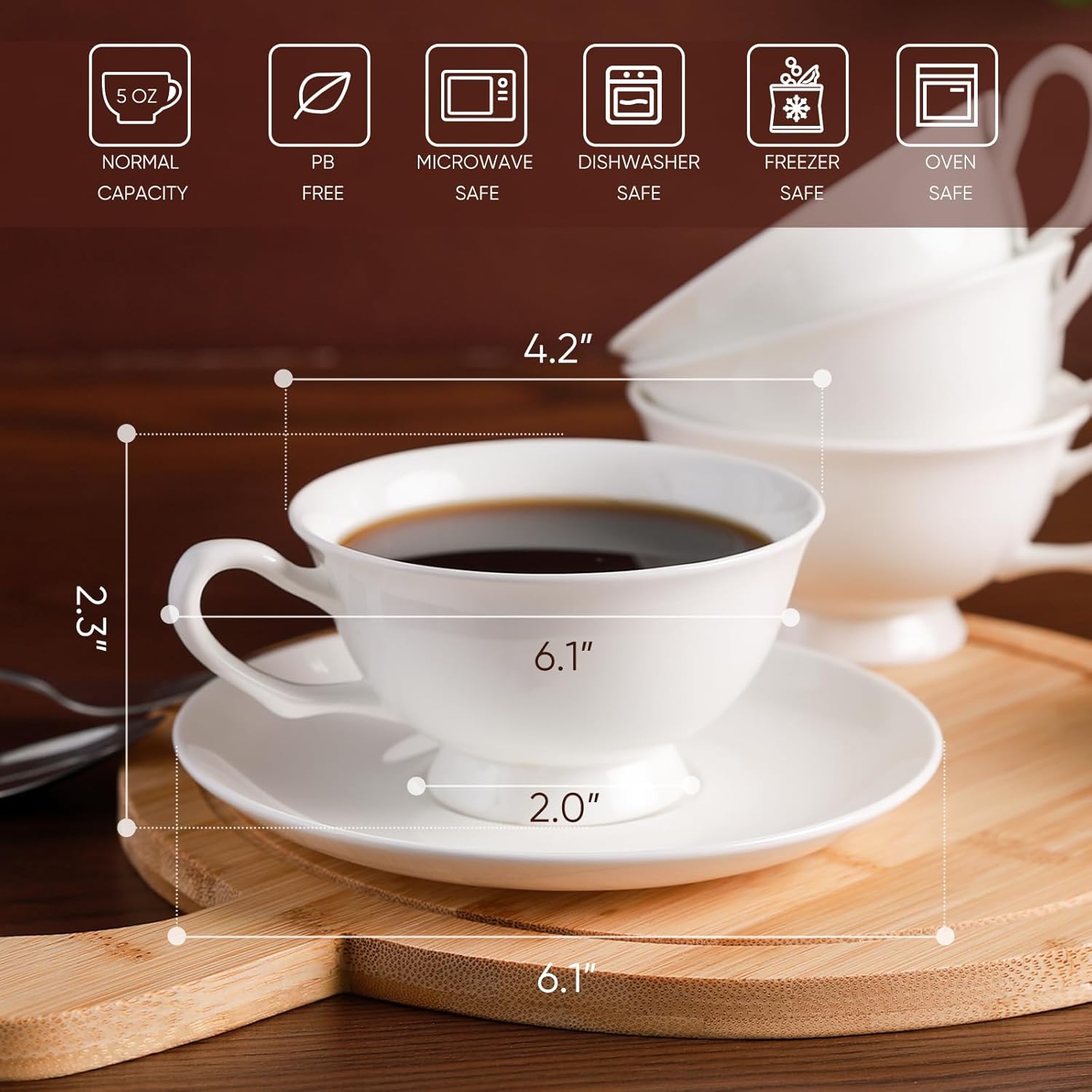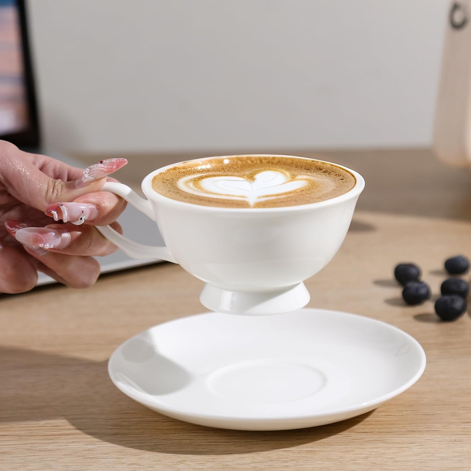 - [Elegant Design] This tea cup and saucer set includes four 5 oz white fine bone china coffee cups with non-slip saucers. The classic mini cups feature a pure white finish, perfect for latte, cappuccino, or tea time. Ideal for lovers of ceramic, elegant, or vintage tea cups