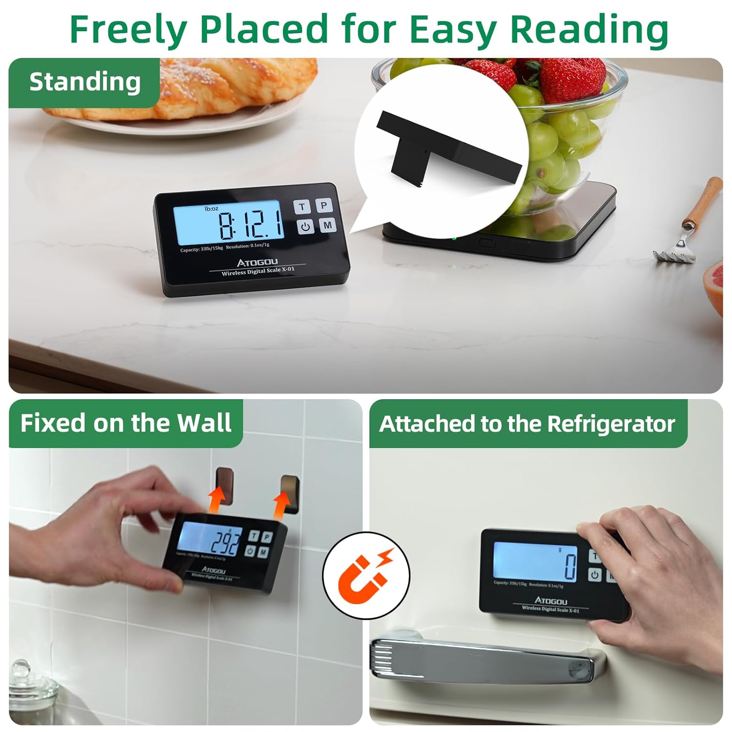 - [ Innovative Wireless Design / Automatic Connection / Magnetic ] The wireless design separates the display from the weighing platform, and they will automatically connect as long as the power is turned on. The separated display has built-in powerful magnets that can be attached to the metallic surfaces or non-metallic surfaces by two adhesive iron sheets (Included). This design prevents unstable weighing results caused by operation, and ensures ease of reading even when weighing large size items such as large bowls and packages.