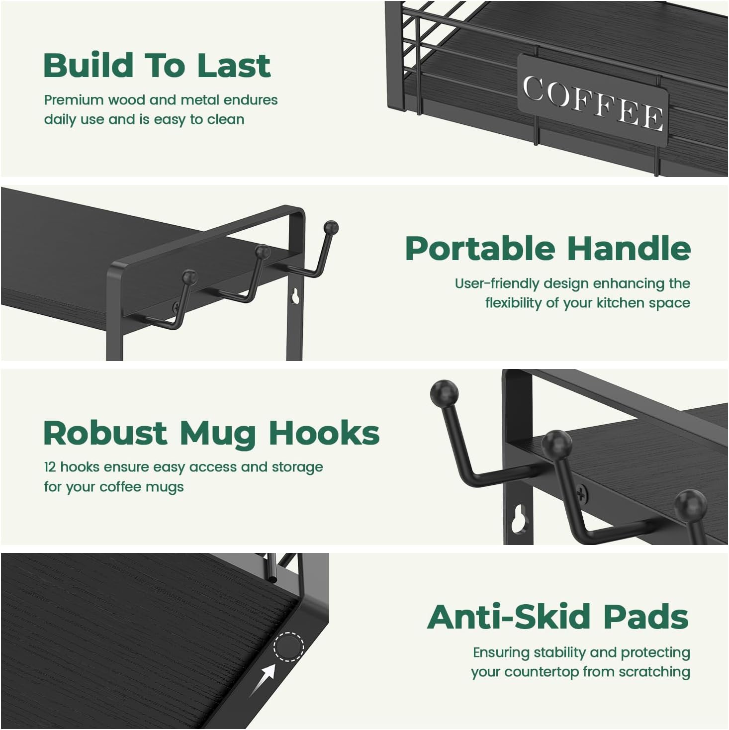 - Spacious Dual-Tier Storage: Transform your home coffee station with EsLuker.ly’s coffee cup holder for countertop, featuring two-tier shelves and 12 mug hooks. This design provides ample space for all your coffee essentials, meeting the storage needs of any family kitchen or office coffee station
