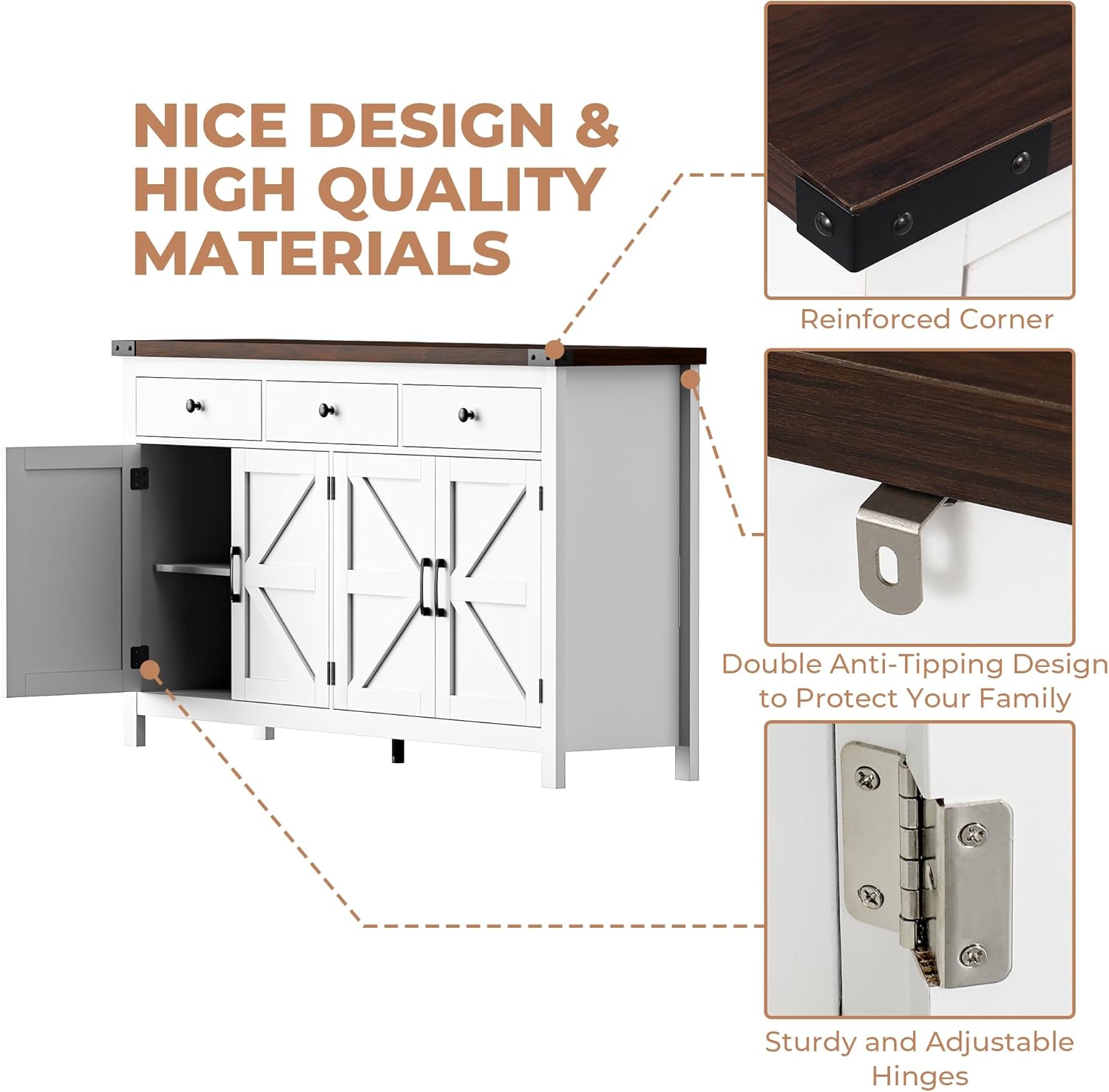 - 【Better Wood】Thicker and Denser Wood. The coffee bar cabinet with 3 drawers and 4 barn doors is made from thicker MDF wood.The material with higher density is sturdier and smoother, largely reducing the likelihood of scratching, peeling and cracking.