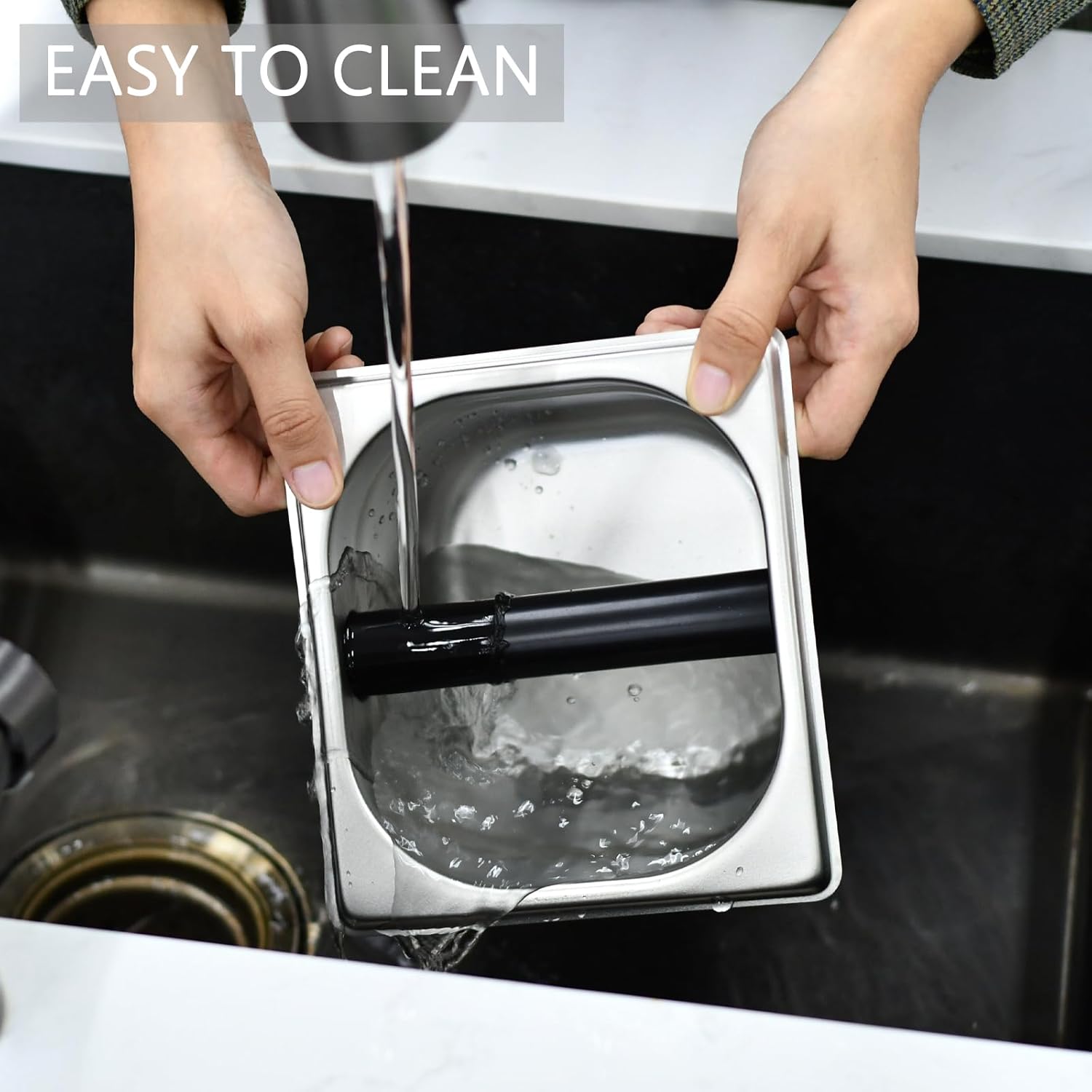 - Durable and Secure: Our Espresso Knock Box is made of high-quality thickened stainless steel, ensuring it is super strong and sturdy. You can knock it without worrying about breaking it. Plus, it is surrounded by silicone protection pads for added safety.