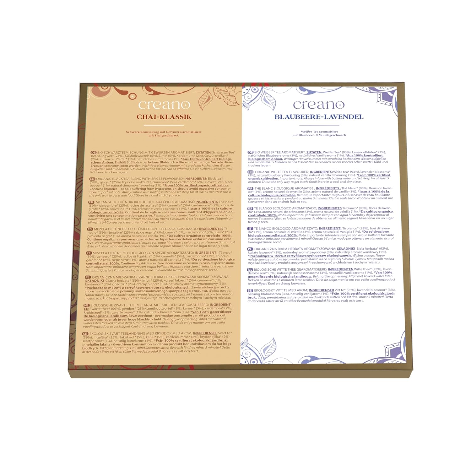 - Creano Organic Tea Mix Gift Set is a unique blend of the different organic tea varieties: Rosemary-Lemon, Morning Tea, Chai Classic, Blueberry-Lavender, Cocoa-Vanilla, Earl Grey Special