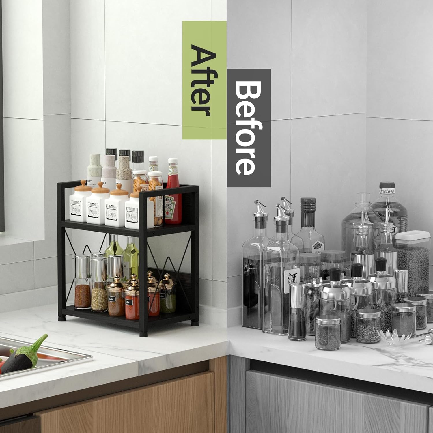 - Efficient Space-Saving Design: The two-tier structure of this kitchen counter organizer provides ample storage for all your coffee bar essentials and spice shelf items, making it a versatile addition to any countertop, whether as a coffee station organizer or a general countertop storage solution