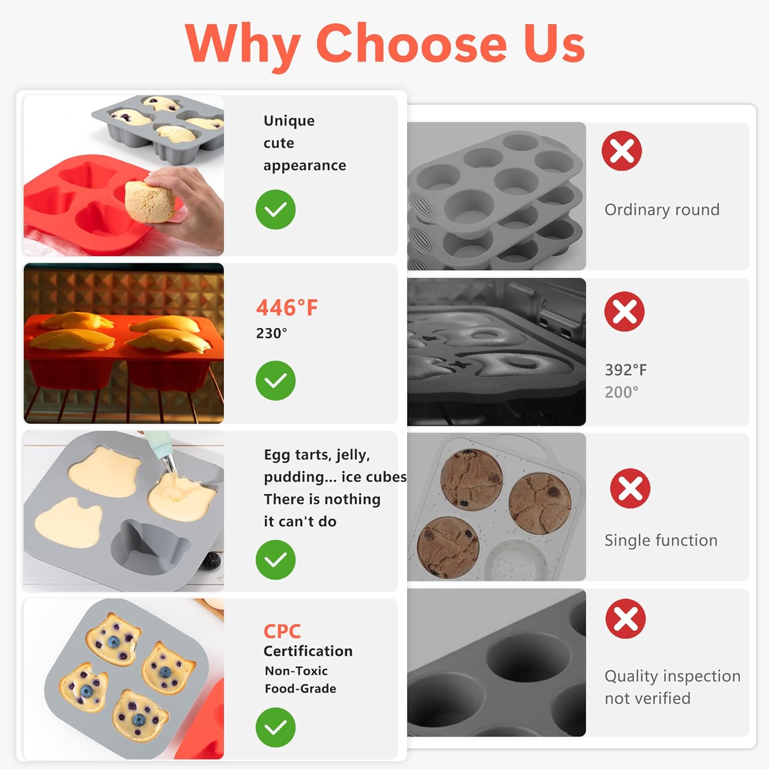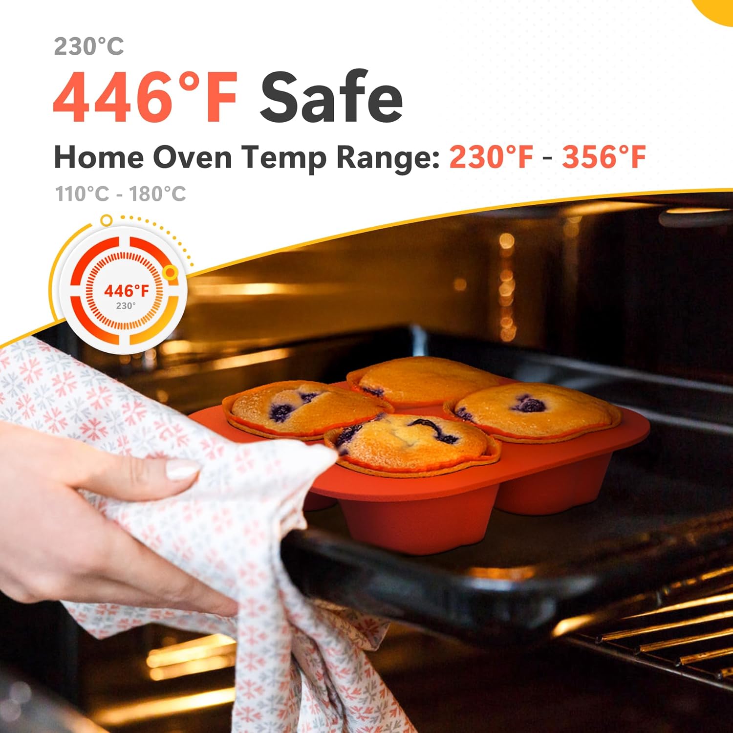 - High Heat Resistance: This cupcake pan can withstand temperatures from -104℉ to 446℉, whether it is traditional oven baking or professional baking equipment that requires precise temperature control, it can still maintain its original shape and performance