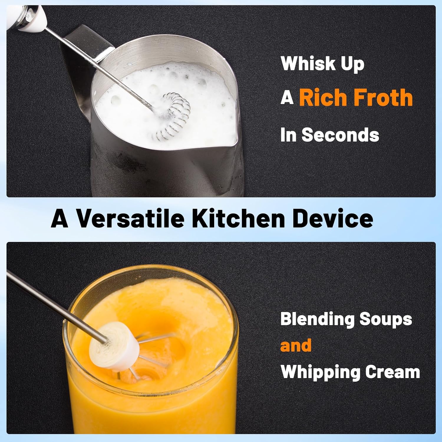 - 【Great for Coffee Lover】: This milk foam maker is lightweight and has ergonomically designed soft touch handle. The frother for milk and coffee is so handy and useful that can for your friends and family too as gift. (Package come with 1 milk frother, 1 extra egg whisk head, 1 Stand,,1 USB-C cable and 1 instruction).