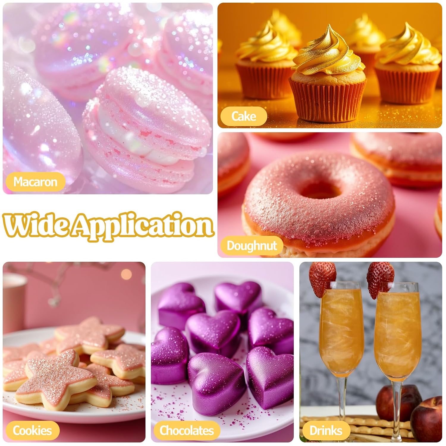 - Widely Used - This edible glitter is perfect for DIY wine, cocktails, champagne, drinks, beer, soda and more. it also can be sprinkled directly on the food, used to decorate cakes, cookies, chocolates, macarons, fruit platters, cupcakes, strawberries, lollipops, ice cream and more. It is also a great decoration for christmas, easter, halloween, thanksgiving, birthdays or any memorable holiday