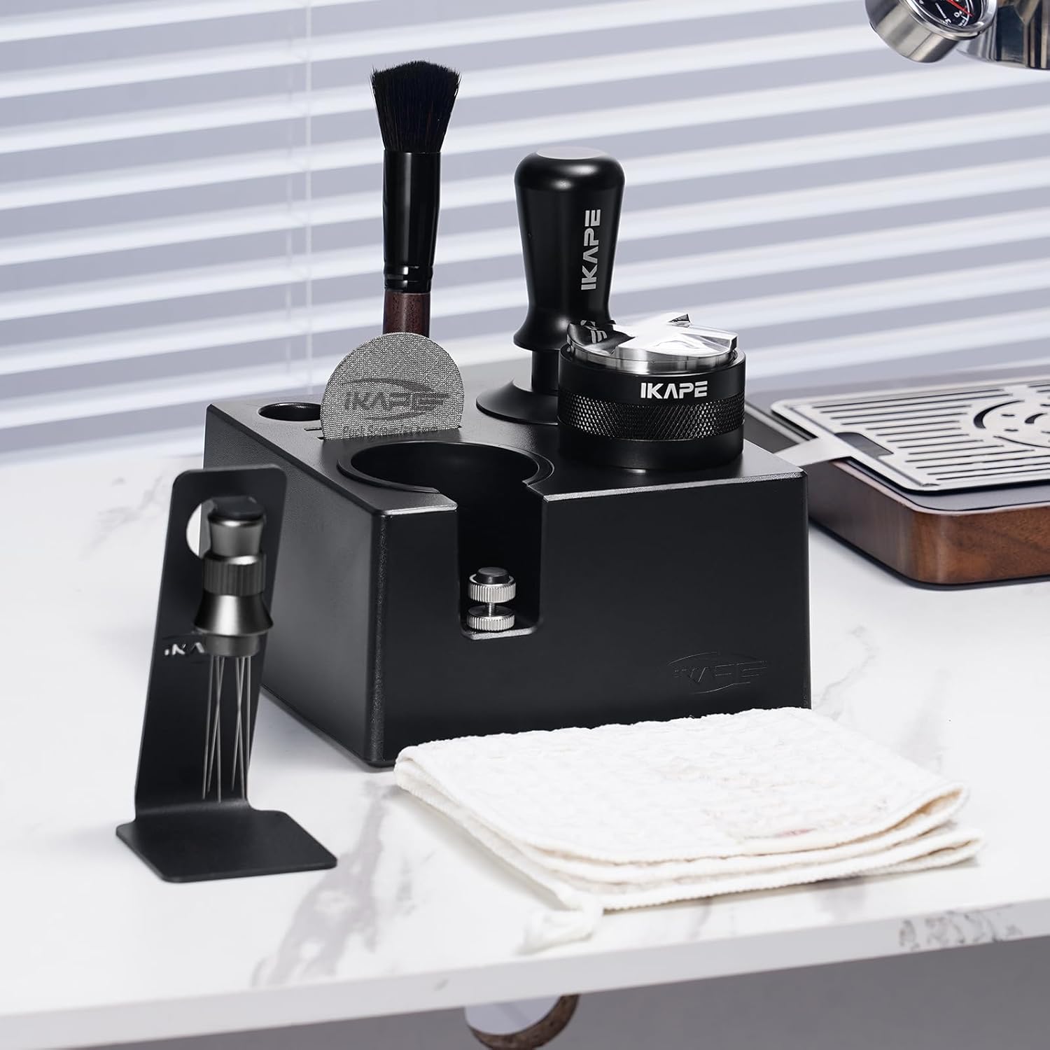 IKAPE 53MM Black Espresso Tool Set 8 IN 1, Coffee Tamper, Distributor, Magnetic Funnel, Puck Screen, Tamper Station, Stirrer Distribution Tool, Cleaning Towel and Brush