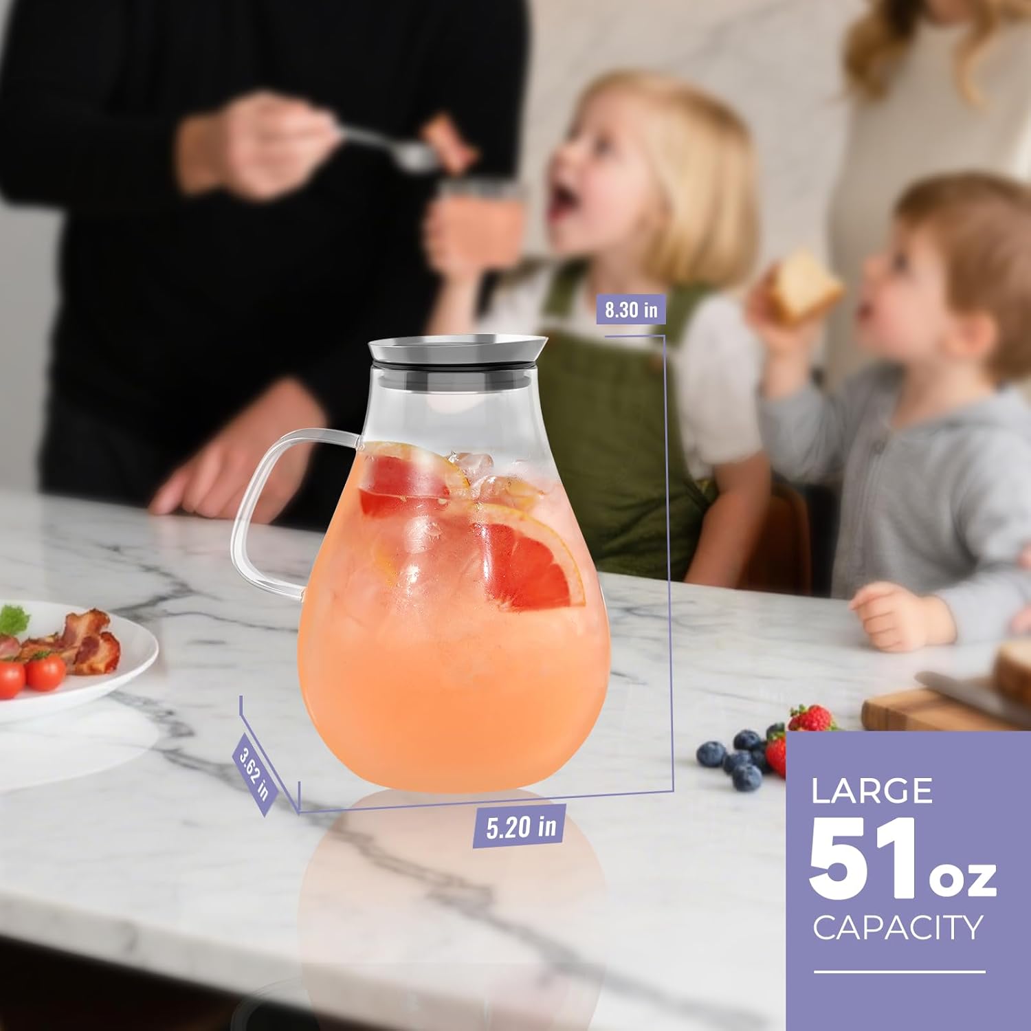 - Perfectly Sized Capacity: With a generous 1.5Liter or 51oz capacity glass pitchers with handle and lid, it is ideal for serving homemade iced tea, juice, sangria, cocktails, coffee, or milk. Whether you're hosting a party, enjoying a picnic, or need a stylish glass water pitcher for your bar, the leak-proof glass jug has got you covered.