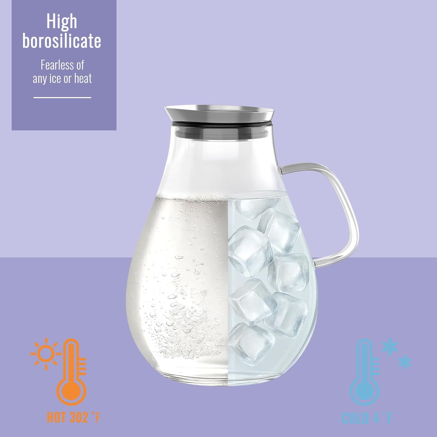 - Vintage Elegance: WARMSIMPLE glass pitcher with lid stands out with its unique streamlined design, Equipped with reinforced handle and 304 stainless steel silver lid . This glass tea pitcher's crystal-clear glass body sparkles in the sunlight when filled with water, adding an elegant touch to your kitchen decor.