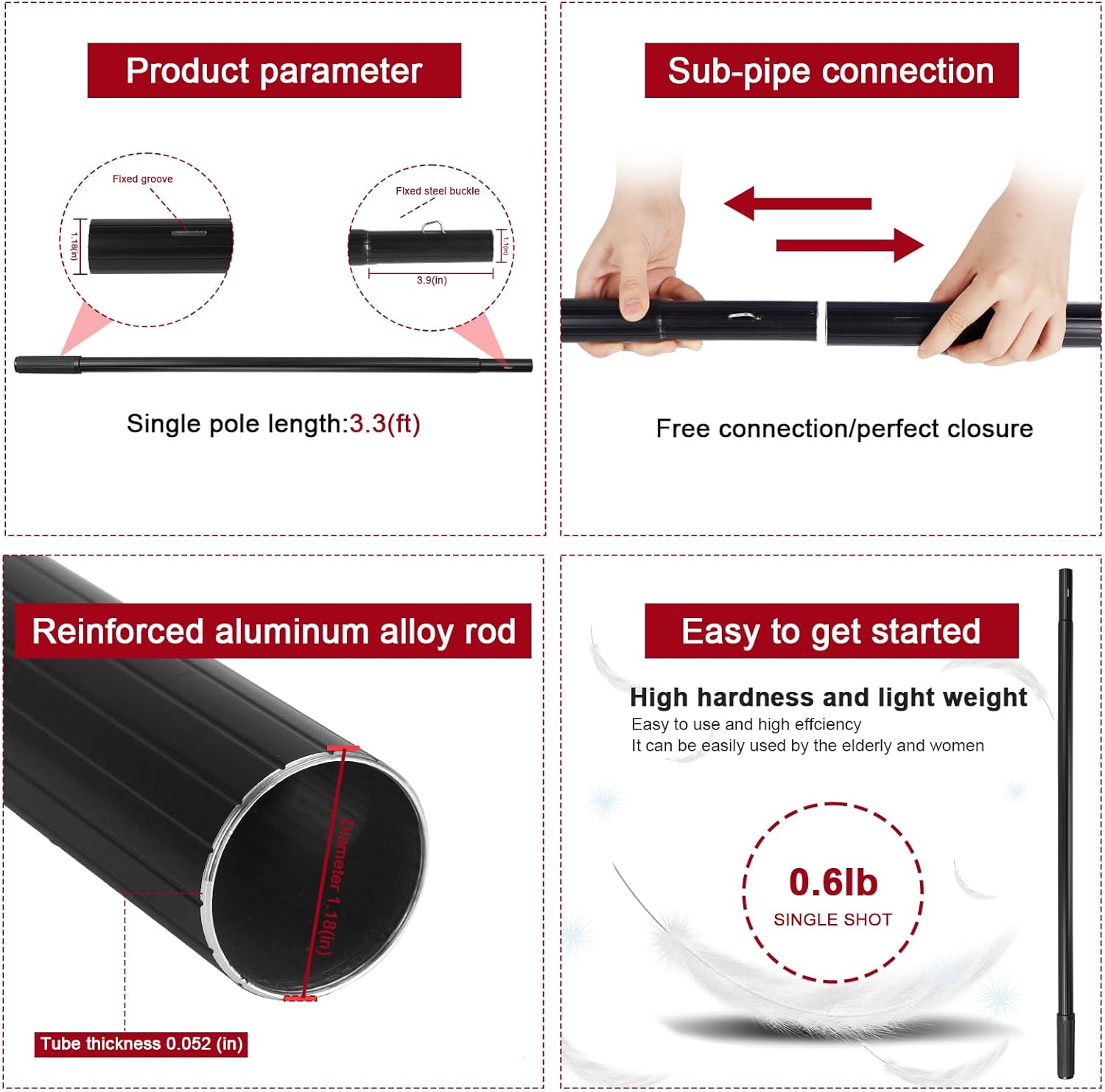 - Aluminum Pole: Crafted from lightweight aluminum, this pole is not only sturdy and corrosion-proof but also resilient, maintaining its shape even at maximum length. When not in use, simply fold it away for convenient storage, making it effortless to carry and store.