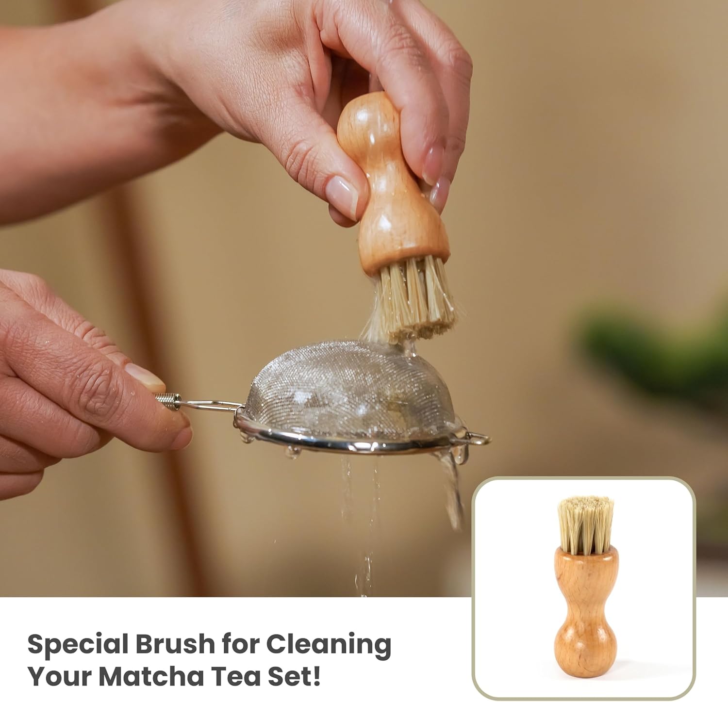 - YABERCHA MATCHA TEA SET (10 PCS): Ceramic Matcha Bowl with Spout, Bamboo Whisk (Chasen), Whisk Holder (Chasen Holder), Bamboo Spoon (Chashaku), Matcha Tea Sifter, Spoon Holder, Cotton Tea Towel, Wooden Measuring Spoon, Measuring Cup, Cleaning Brush